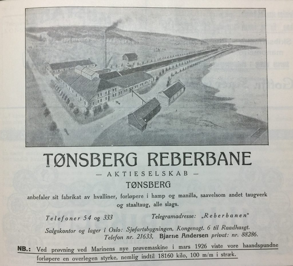 The Christian Salvesen Company archives are held at Edinburgh University. While reading a page about the archives (http://libraryblogs.is.ed.ac.uk/edinburghuniversityarchives/2020/01/) I noticed this advertisment for Tønsberg Reberbane AS (Tønsberg Ropeworks Company). Tønsberg is where Emil Gustav Hvaal was living according to the whaler ship records and the newspaper reports above.