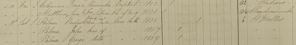 In the event I didn’t find anything of interest or relevant to Bridget and her family. We requested the Admission and Discharge books for Oct 1869-Sep 1871 and found the Bridget Palmer from the census entering the Workhouse7.