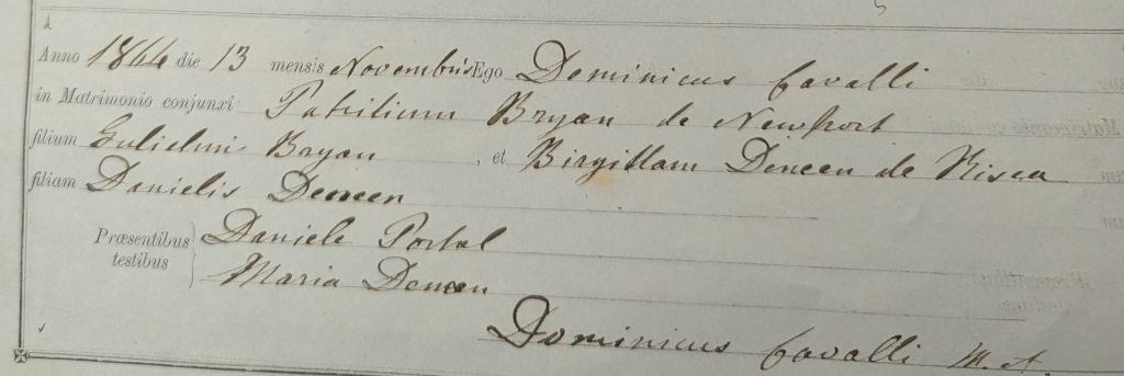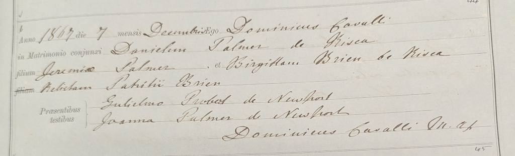 We found the marriage of Joseph and Bridget in 1872 and got a better photograph of it. We also found Bridget’s marriages to Patrick Bryan and Daniel Palmer. We already have civil registration copies of these so there is no new information but it was interesting to see the original register entry too.