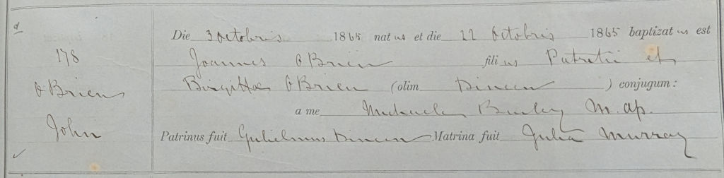John was baptised on the 30 Oct 1865 under the name John O’Brien. As with all the entries in the register the priest wrote the main entry in Latin and the side entry in English. John’s parents were recorded as Patricii OBrien and Birgitta OBrien formerly Dineen. His godparents were Gulielmus Dineen and Julia Murray. These are both new names and Gulielmus (William) Dineen could be a new relative to investigate.