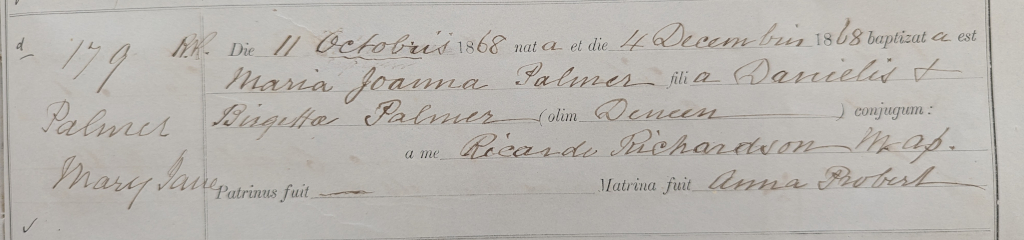 Jane was baptised on 11 Oct 1868 under the name Mary Jane Palmer. Her parents were Danielis and Birgitta Palmer formerly Dineen. Unusually only one godparent is given: Anna Probert.