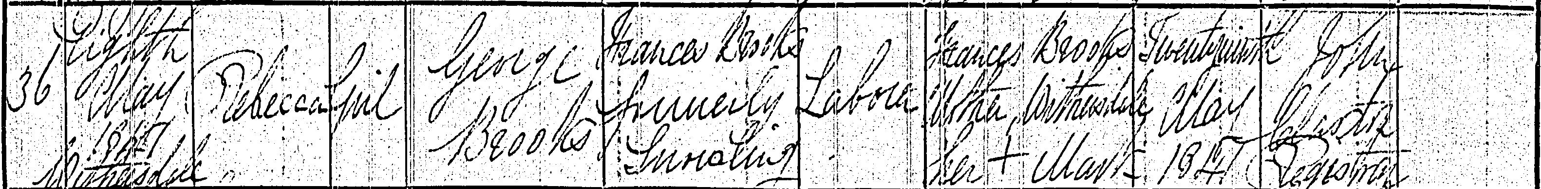 Rebecca Brooks was born on the 8th May 1841a23 in the parish of Withersdalea23, the daughter of George Brooks, a labourer, and Frances Snowling, who had been a servant. Frances carried a family stigma: her father, a former resident of Fressingfield, had been convicted and transported to Australia as a criminal, a fact that would have been well remembered in a close-knit rural community. Rebecca was baptised on the 3rd October 1841y1, a gap of nearly five months between birth and baptism that was becoming more common by the mid-nineteenth century, as the strict promptness of earlier generations gave way to a more relaxed attitude. She came from the same labouring class as William, rooted in the same small corner of north Suffolk.
