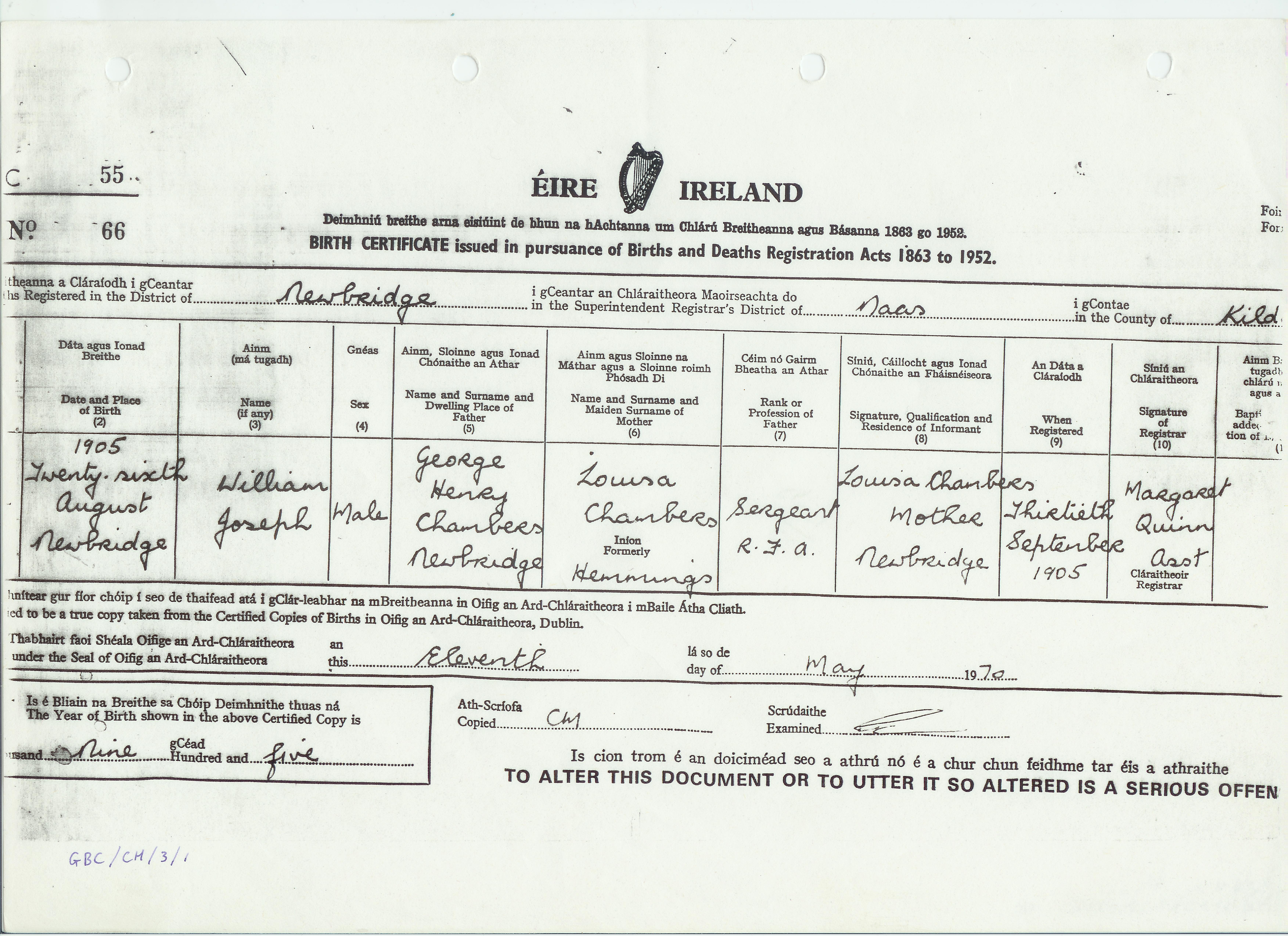 William Joseph Chambers, known throughout his life as Bill, was born on the 26th August 1905 in Newbridge, County Kildare in what was then British controlled Ireland. His father George Henry was serving with the Royal Field Artillery in Ireland. He was the fifth of George and Louisa’s eight children, and the second son. His early childhood was spent following the postings of a military family, and by the time the household settled in Newcastle upon Tyne he was still an infant.