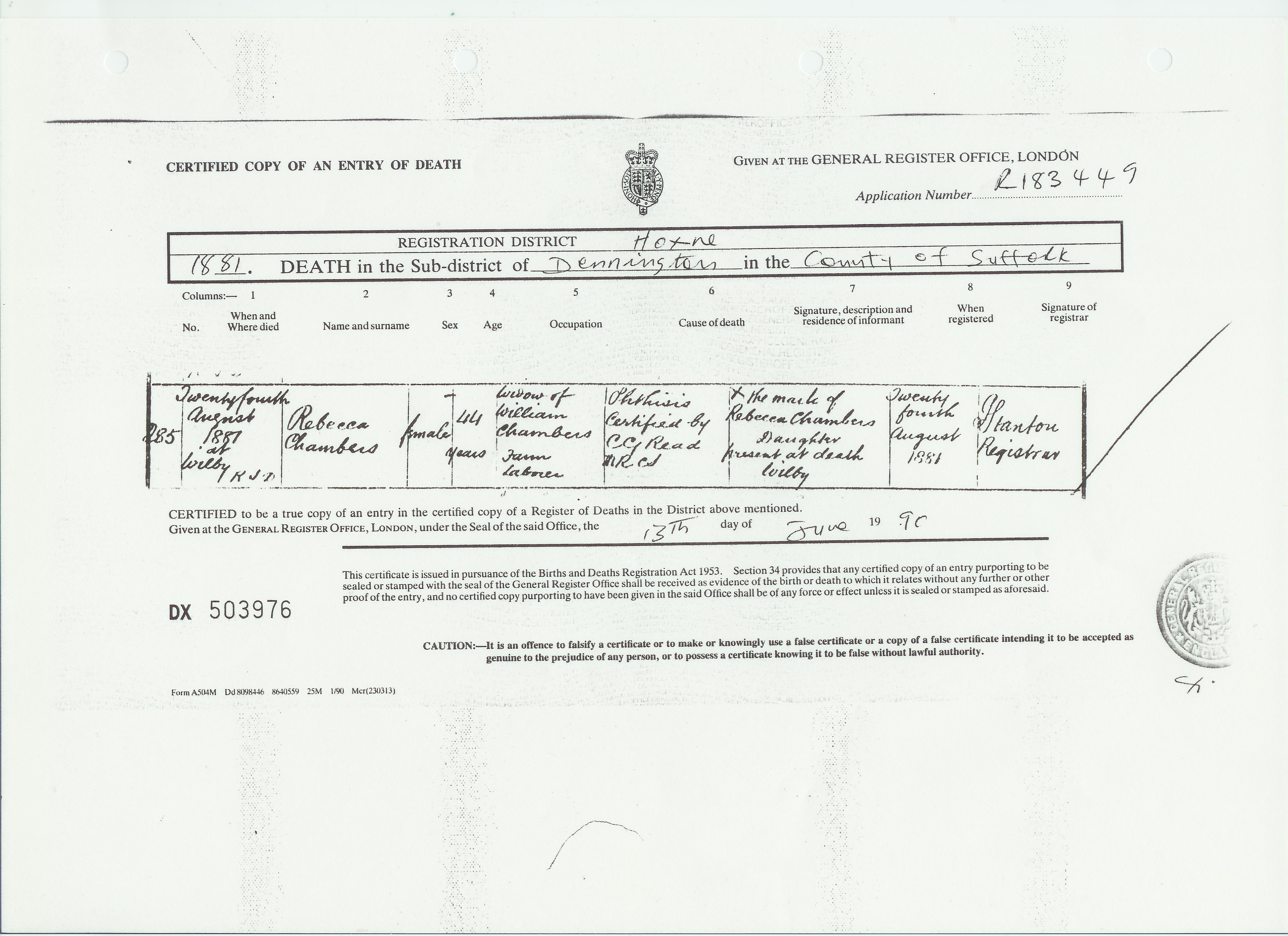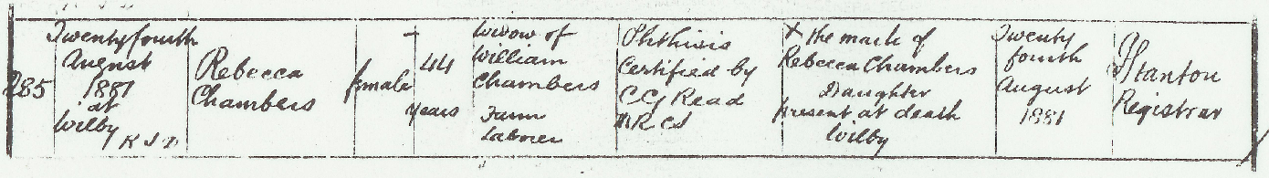 But the reprieve was brief. Just four months after the census was taken, Rebecca died on the 24th August 1881 in Wilby, at the age of fortya18. The cause was recorded as phthisis, the medical term for pulmonary tuberculosis, the disease that was the single greatest killer in Victorian England. Rebecca’s own father, George Brooks, had died of the same disease twenty years earlier, at the age of forty-three. She was buried on the 28th August at St Mary’s in Wilbyq3, leaving eight children orphaned.