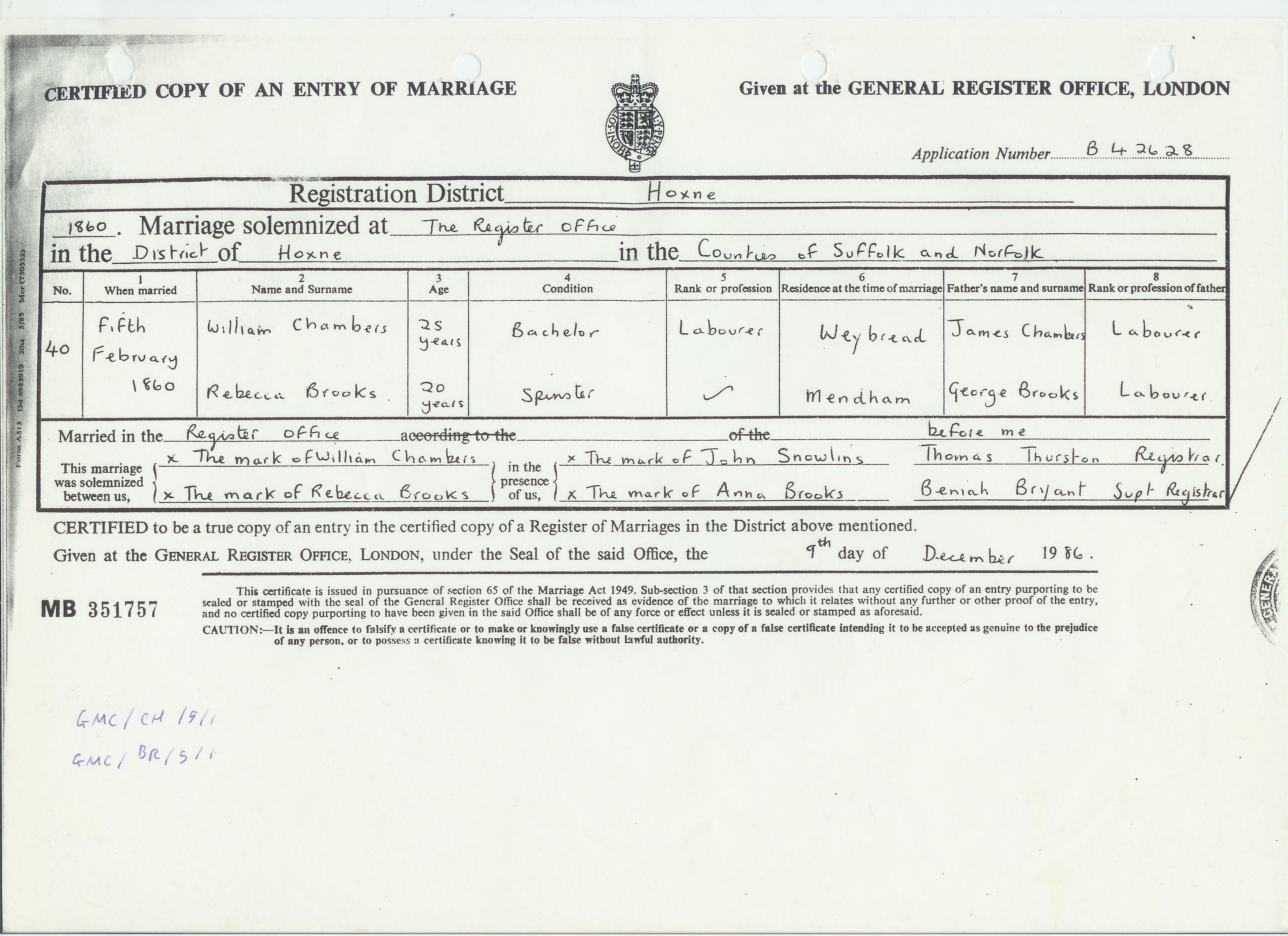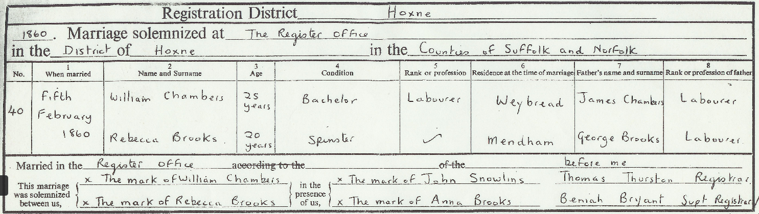 William and Rebecca married on the 5th February 1860a22 at the Register Office in Hoxnen2, just a few miles to the west. William was twenty-six; Rebecca was eighteen and five months pregnant with their first child. The witnesses were both from Rebecca’s side of the family, her mother’s brother John Snowling and her younger sister Anna Maria Brooks, then only sixteen years old. Neither William, Rebecca or either of the witnesses were able to sign their own names.