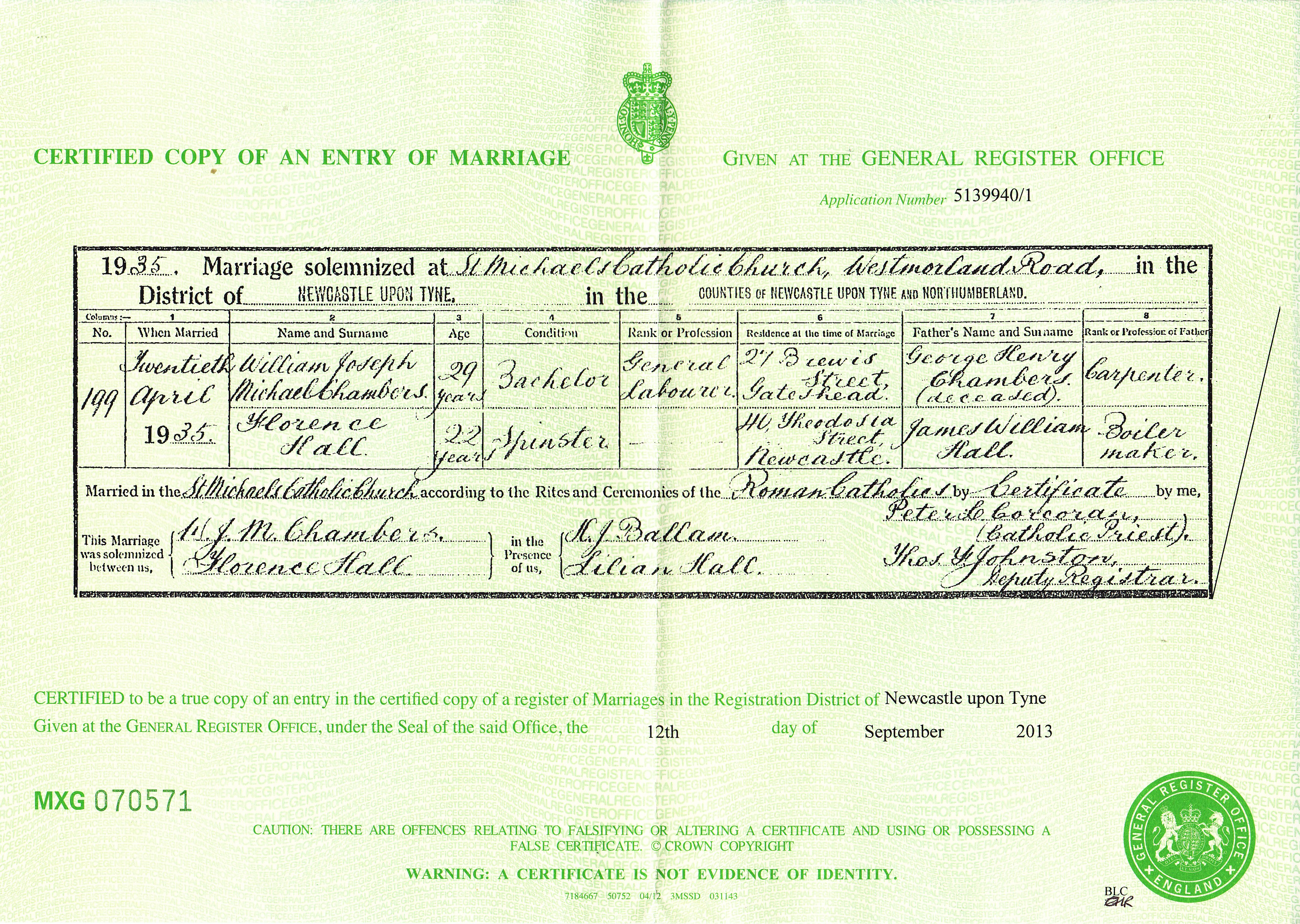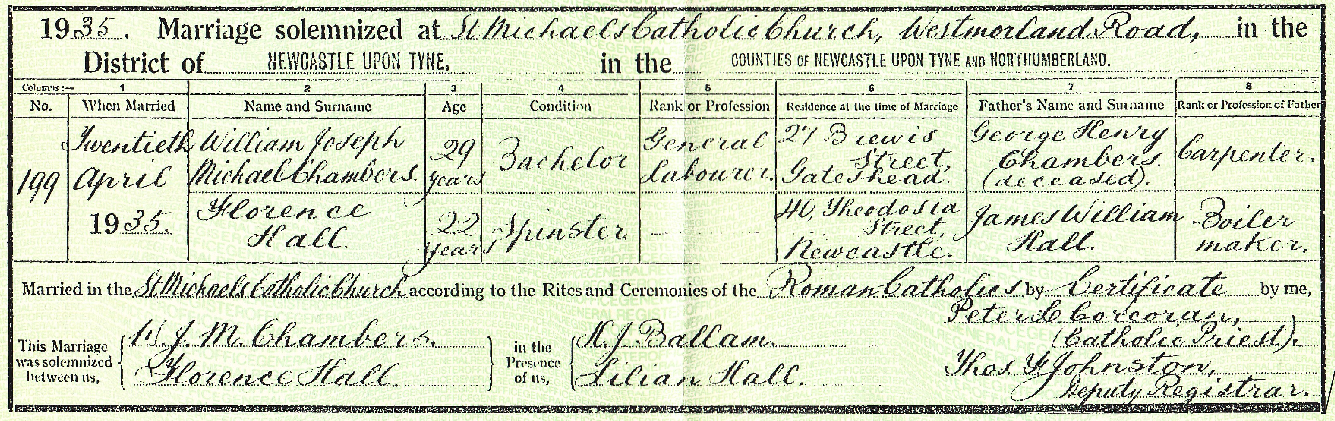 William married Florence Hall on the 20th April 1935 at St Michael’s Roman Catholic Church in Elswick, Newcastle upon Tynea3, the same church where he and his siblings had attended school as children, and which his father George had chosen to keep the family connected to their mother’s Catholic faith.