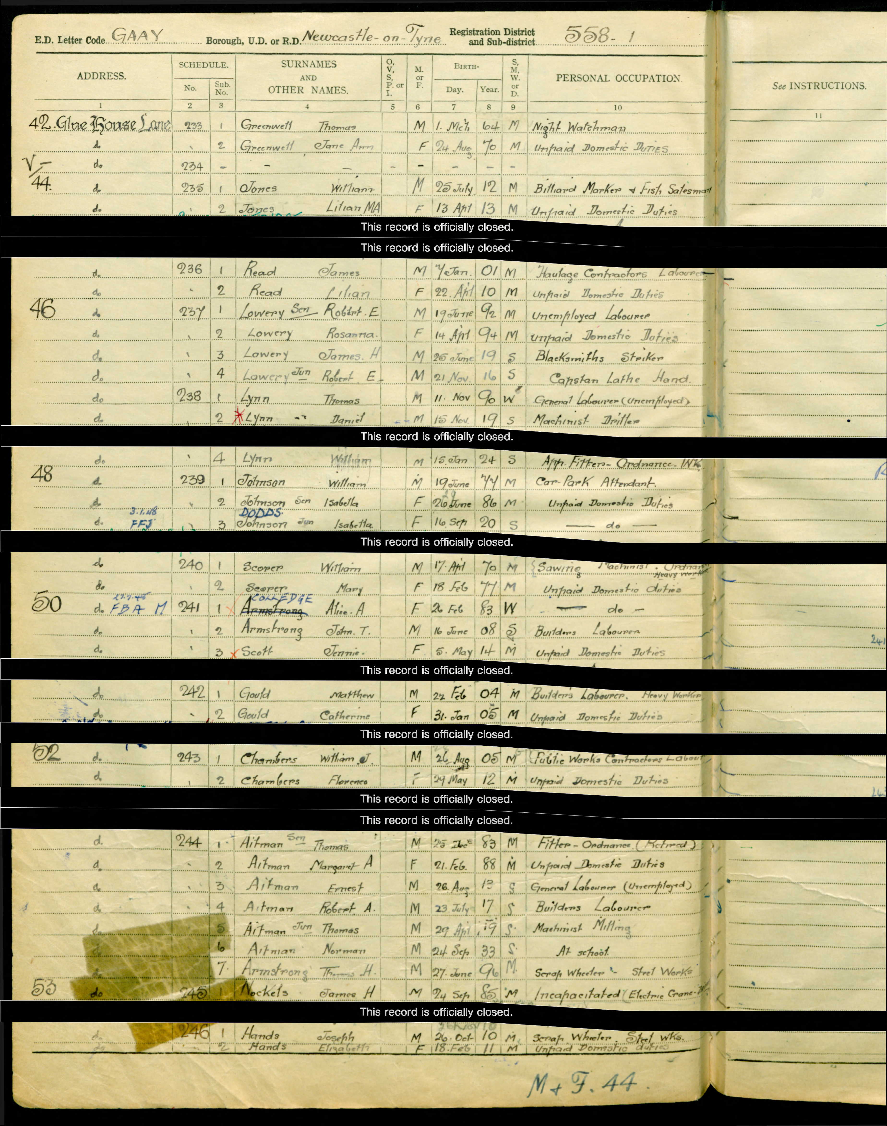 By the time of the 1939 register William and Florence were living in Glue House Lane in Elswickb1, close to where William had grown up, with their two eldest children. William was recorded as working as a public works contractor’s labourer.