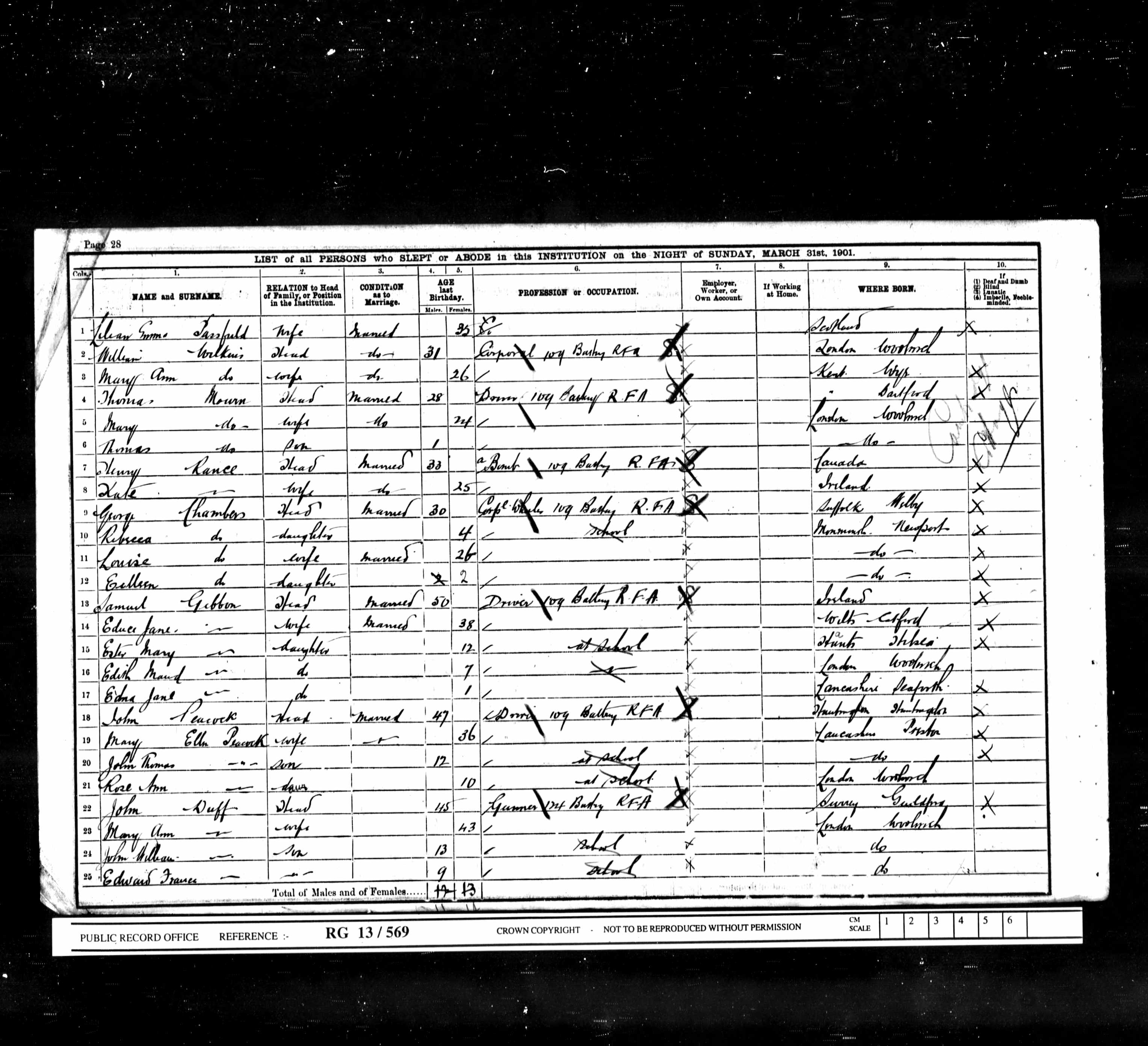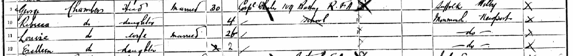 George Henry Chambers was born on the 2nd February 1867 in Wilbyq1, the fourth child of William Chambers and Rebecca Brooks. He was baptised with three of his siblings on the 4th April 1869 at St Mary’s Church, Wilbyq1, as part of the family’s renewed relationship with the church following the arrival of the Reverend Marriot. His father died of tetanus when he was twelve, his mother of tuberculosis two years later, and the eight orphaned children were scattered into institutional care. George ran away from an orphanage and enlisted in the Royal Artillery.