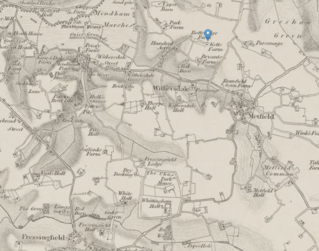 By the time of the 1851 censusz1, William had left the family home on Church Street in Fressingfield. He was seventeen and living at Kett’s Farm in Withersdale, a tiny parish on the Norfolk–Suffolk border about five miles north-east of Fressingfieldz1. The name Kett’s Farm carries a faint historical echo, as Robert Kett led a famous agrarian rebellion in Norfolk in 1549, though whether the farm had any genuine connection to that episode I can’t say.