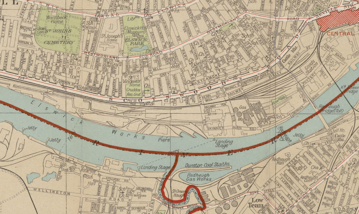 The map of Tyneside above shows Theodosia Street runing east-west in the far top left corner, close to St. John’s Cemetery, while Cato Street and Brewis Street can be found at the far bottom right northwest off Redheugh Road. Running along the right-hand edge of St. John’s Cemetery is Gluehouse Lane, with Joseph Street running parallel just to its left. Further into the map, St. Michael’s Church sits just below Elswick Park, occupying the corner where Westmoreland Road meets Clumber Street. The great Elswick Works occupied the area between the Tyne and the Scotswood Road.