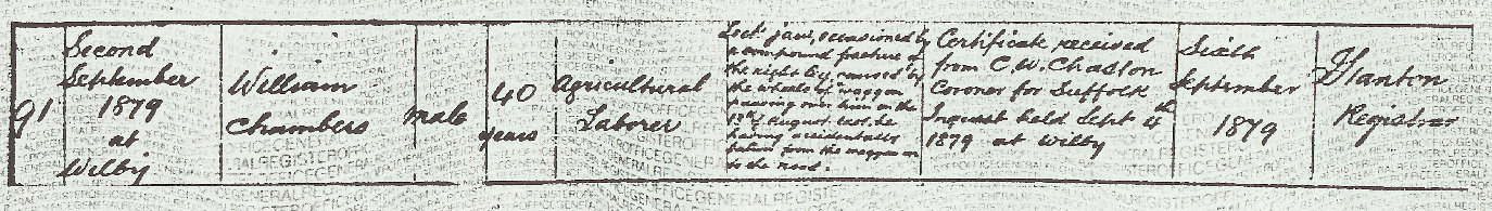 On Saturday the 30th August 1879, William was in charge of a wagon and four horses when he fell from his seat. The wheels of the wagon passed over his right leg, crushing it so badly that the bone was shattered in a compound fracture. Mr C. G. Read, a surgeon from Stradbroke, attended him and decided that the only course of action was amputation. The operation was carried out, but two days later tetanus set in, the bacteria entering through the catastrophic wound, and on Tuesday the 2nd September, William dieda19. He was forty-six years old. Robert, his youngest child, was just four months old.