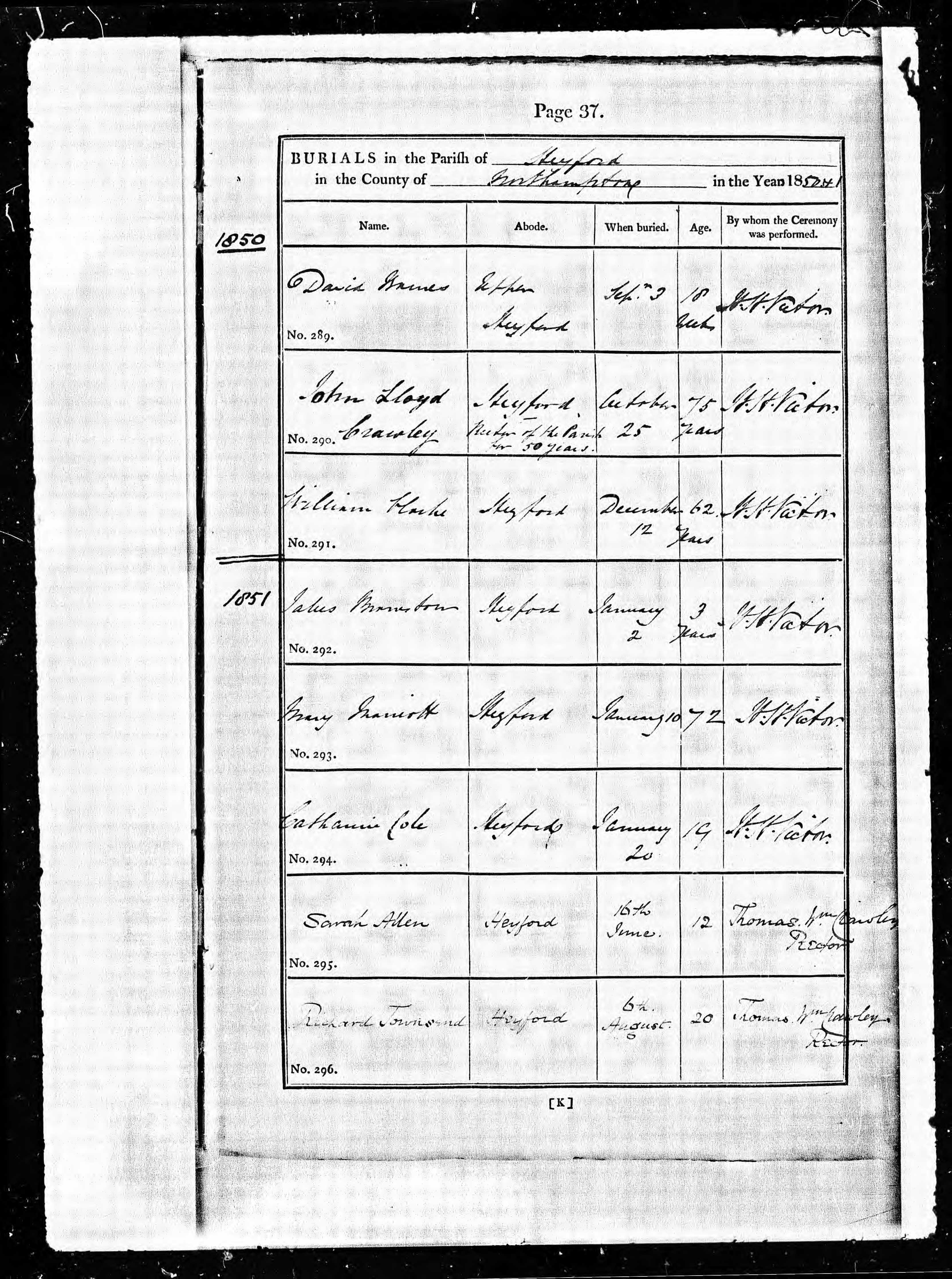 - William Clarke★ was resident on 12 Dec, 1850 in Nether Heyford, Northamptonshire, England
