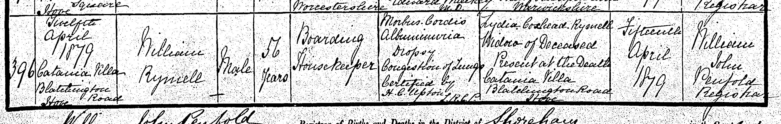 Death in the Registration District of Steyning, Sussex, 1879, no. 396. Died 12 Apr 1879 at [Catania] Villa, Blatchington Road, Hove; William Rymell; Male; age 56; Boarding House Keeper. Cause of death: Morbus cordis, albuminuria, dropsy, congestion of lungs; certified. Informant was Lydia Coxhead Rymell (signed name); relation: Wife; residing at [Catania] Villa, Blatchington Road, Hove; present at death. The death was registered 15 Apr 1879.
