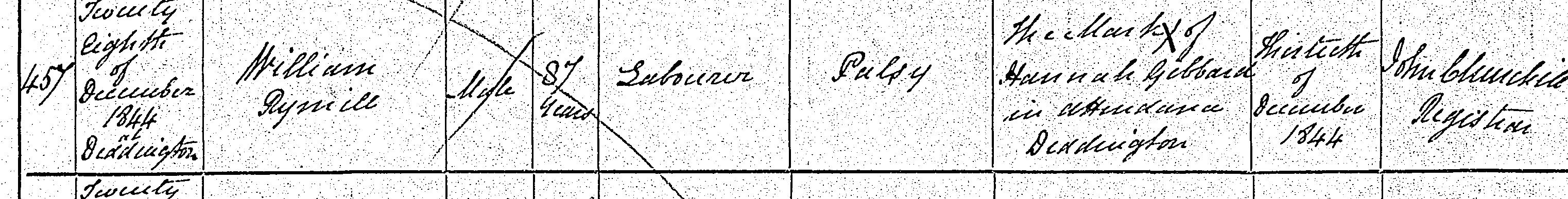 Death in the Registration District of Woodstock, Oxfordshire, 1844, no. 457. Died 28 Dec 1844 at Deddington; William Rymill; Male; age 87; Labourer. Cause of death: Palsy. Informant was Hannah Gibbard (could not sign name); relation: Not known; residing at Deddington; present at death. The death was registered 30 Dec 1844.