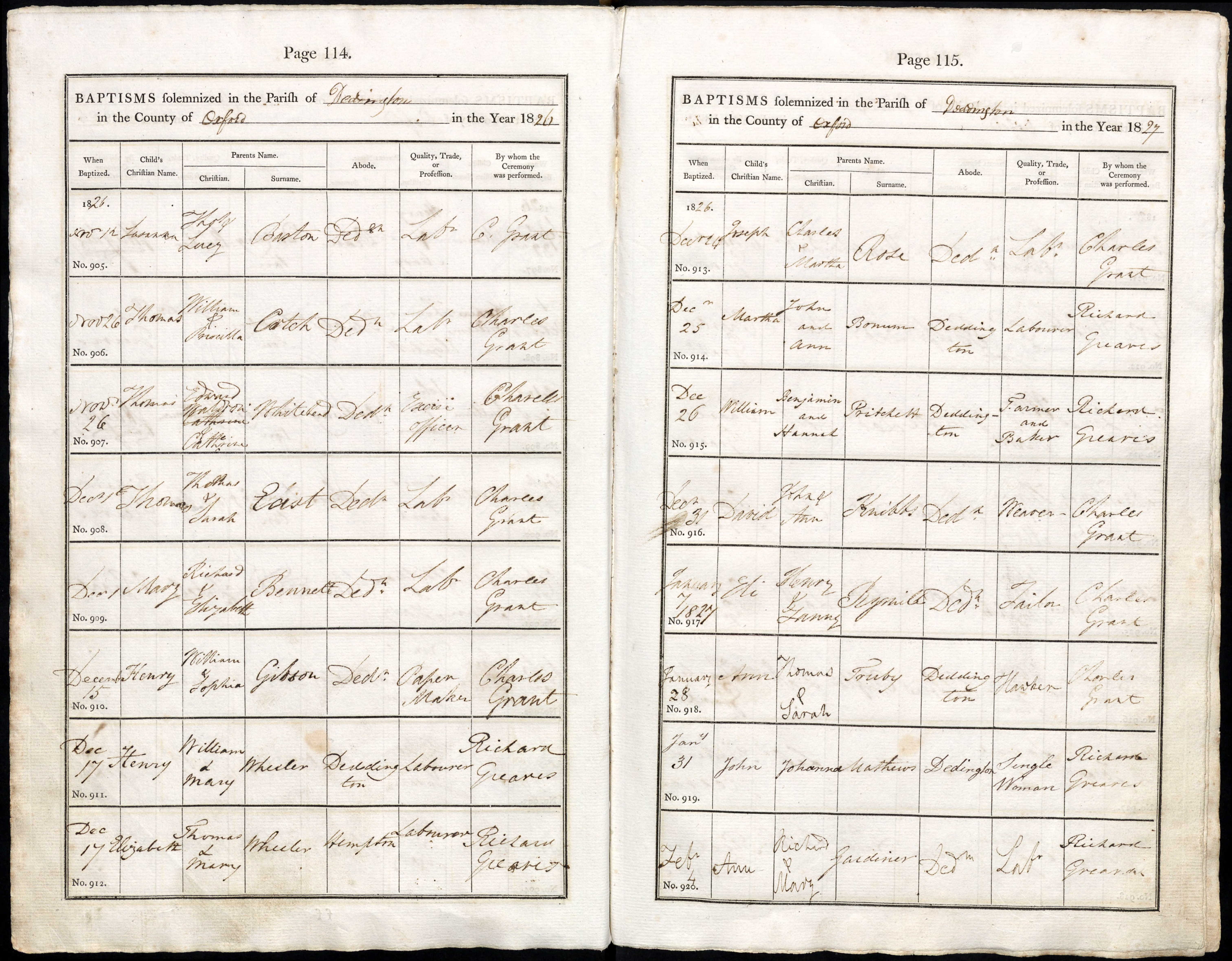 Parish Registers of St. Peter & St. Paul, Deddington, Oxfordshire; Baptism entry for Eli Rymill, 7 Jan 1827, Page 115, No 917.