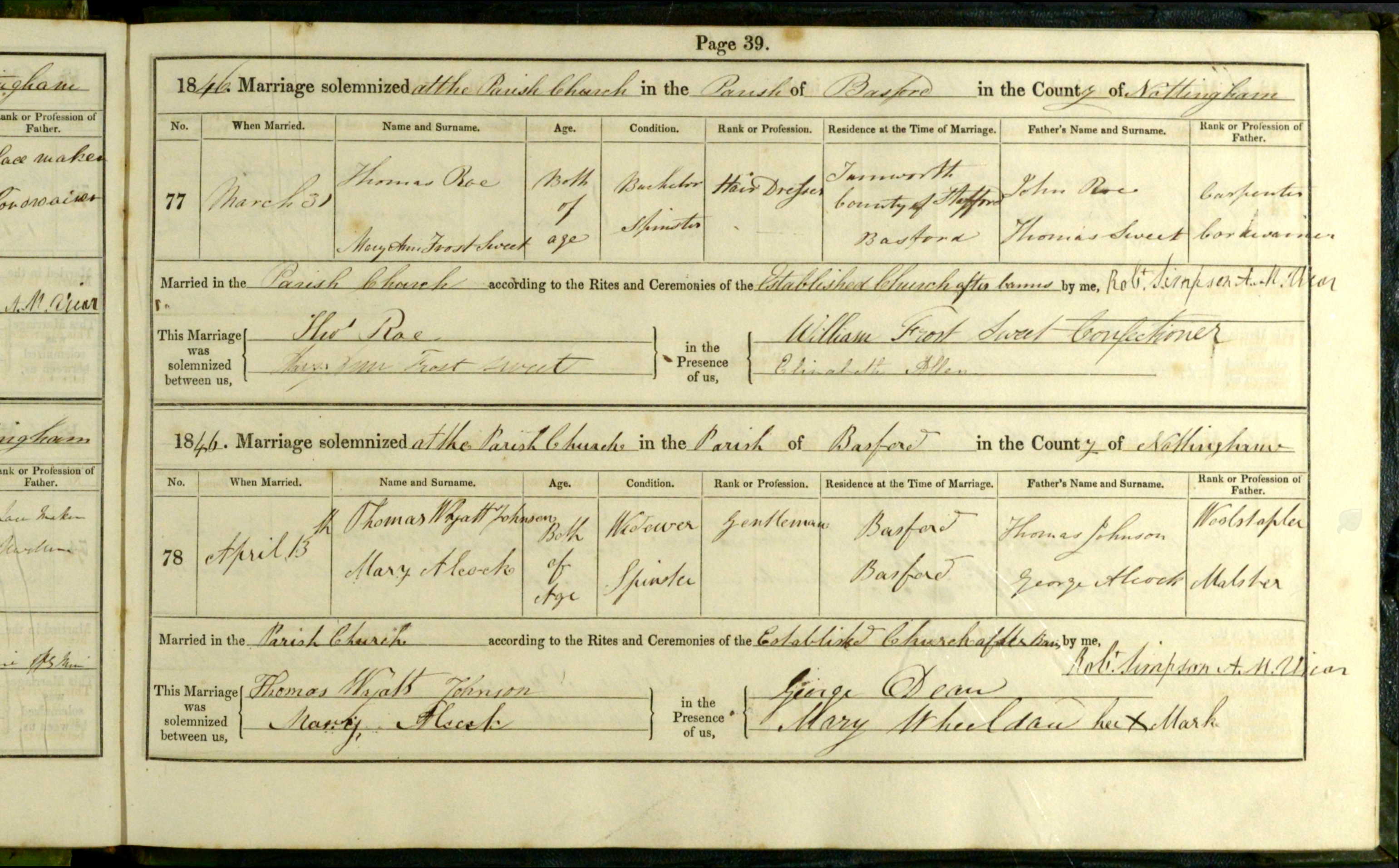 Parish Registers of St Leodegarius, Basford, Nottinghamshire; Marriage entry for Thomas Wyatt Johnson and Mary Alcock, 13 Apr 1846, Page 39, No 78.