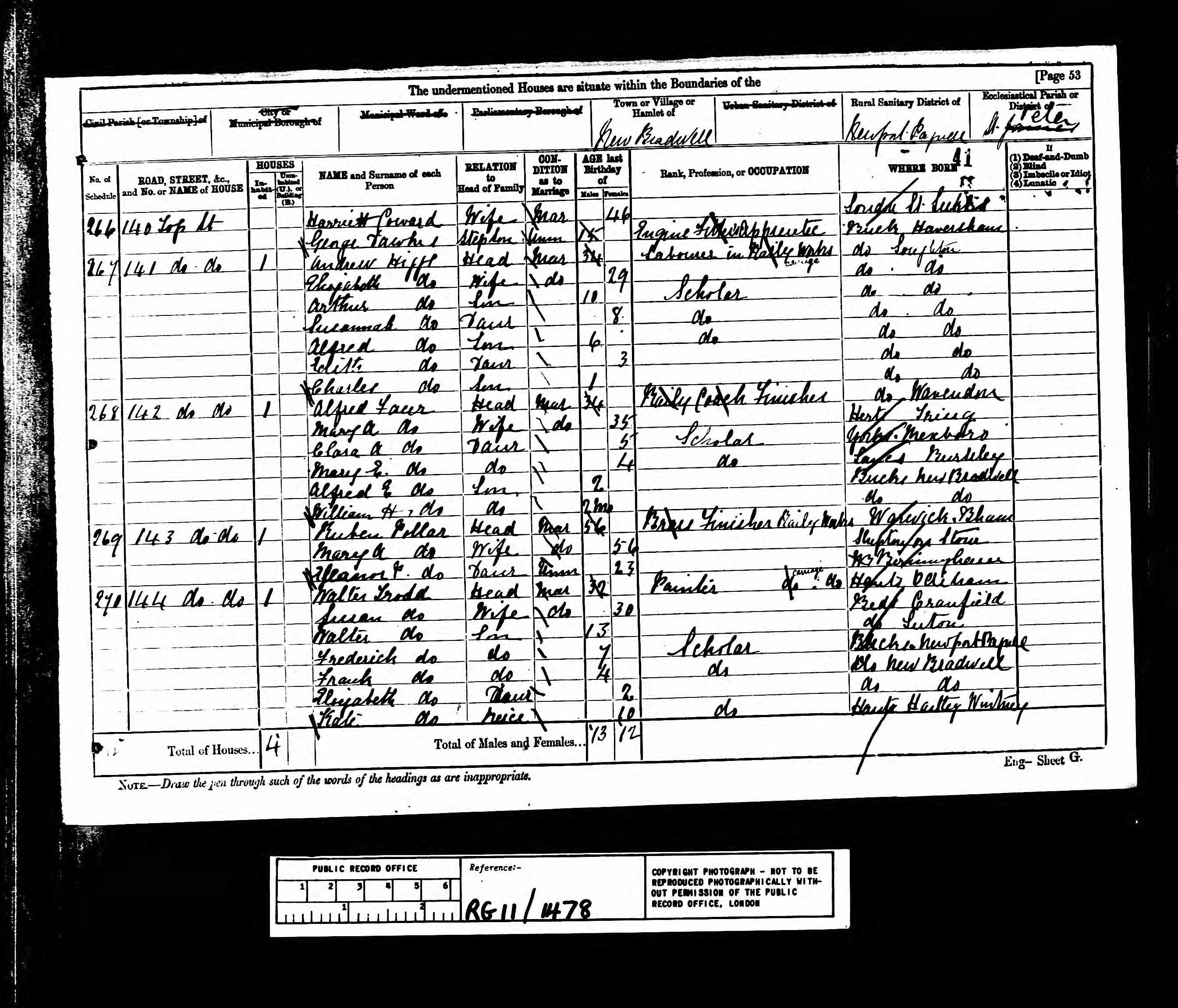 - was recorded in the census on 3 Apr, 1881 at 142 Top Street, New Bradwell, Buckinghamshire, England