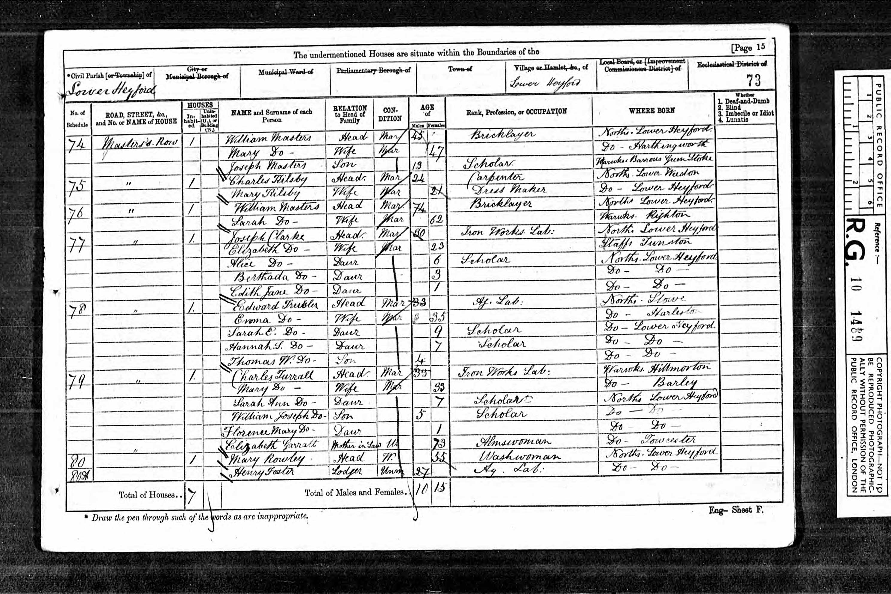 - was recorded in the census on 2 Apr, 1871 at Masters Row, Nether Heyford, Northamptonshire, England