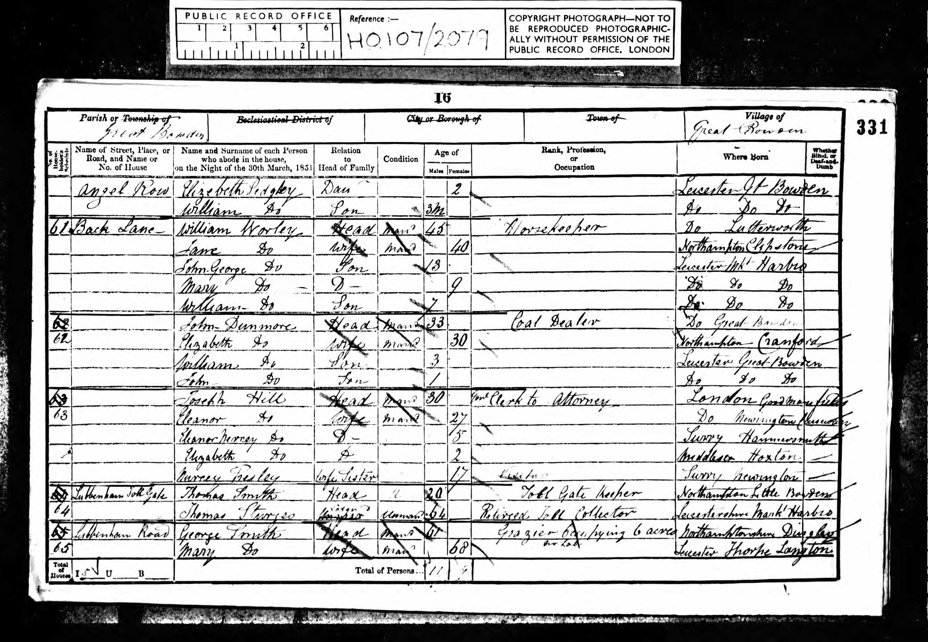 - was recorded in the census on 30 Mar, 1851 at Back Lane, Great Bowden, Leicestershire, England