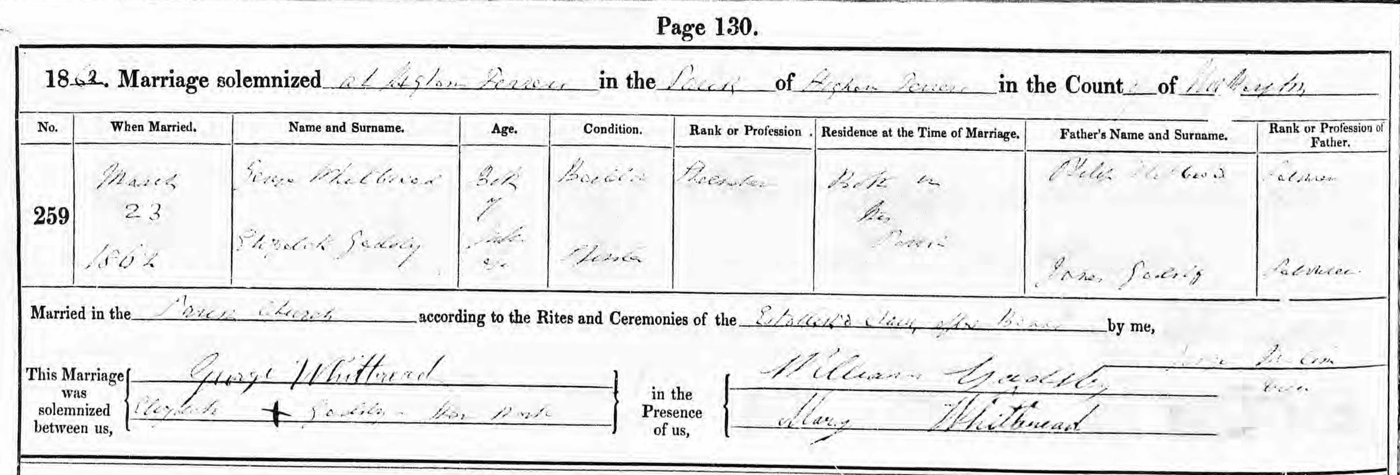 Parish Registers of St.Mary, Higham Ferrers, Northamptonshire; Marriage entry for George Whitbread and Elizabeth Gadsby, 23 Mar 1862, Page 130, No 259.