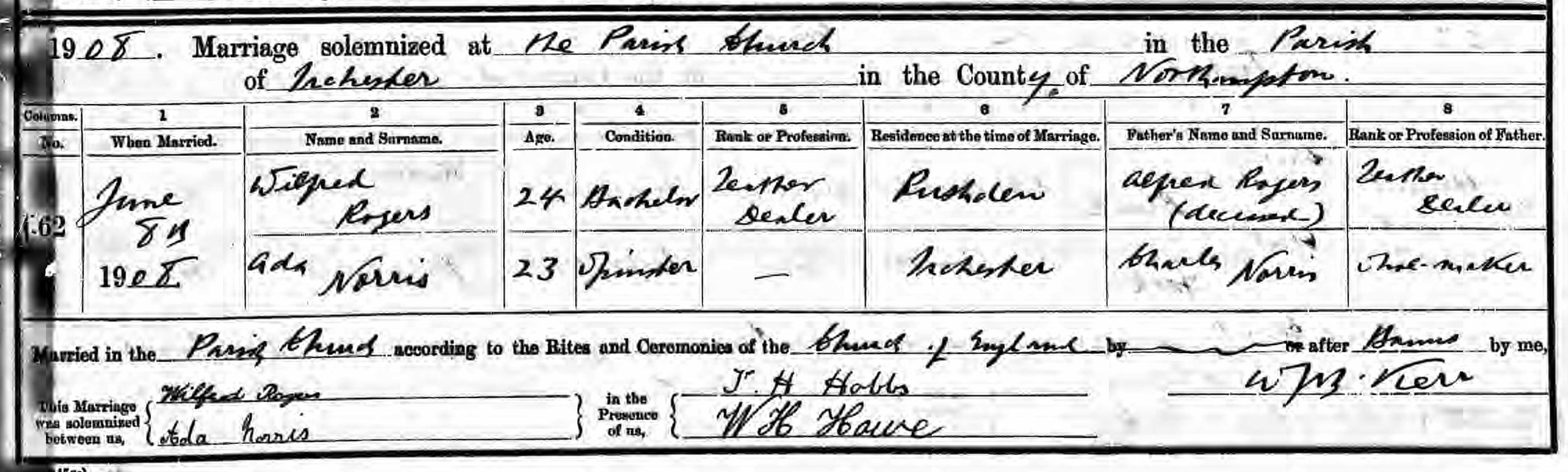 Wilfred Rogers, 24, Bachelor, occupation Leather Dealer, abode Rushden and Ada Norris, 23, Spinster, abode Irchester. Married by Banns. Groom's father: Alfred Rogers (deceased), occupation Leathee Dealer. Bride's father: Charles Norris, occupation Shoe-maker. Groom signed name. Bride signed name. Witness: J. H. Hobbs (signed). Witness: W. H. Hare (signed).