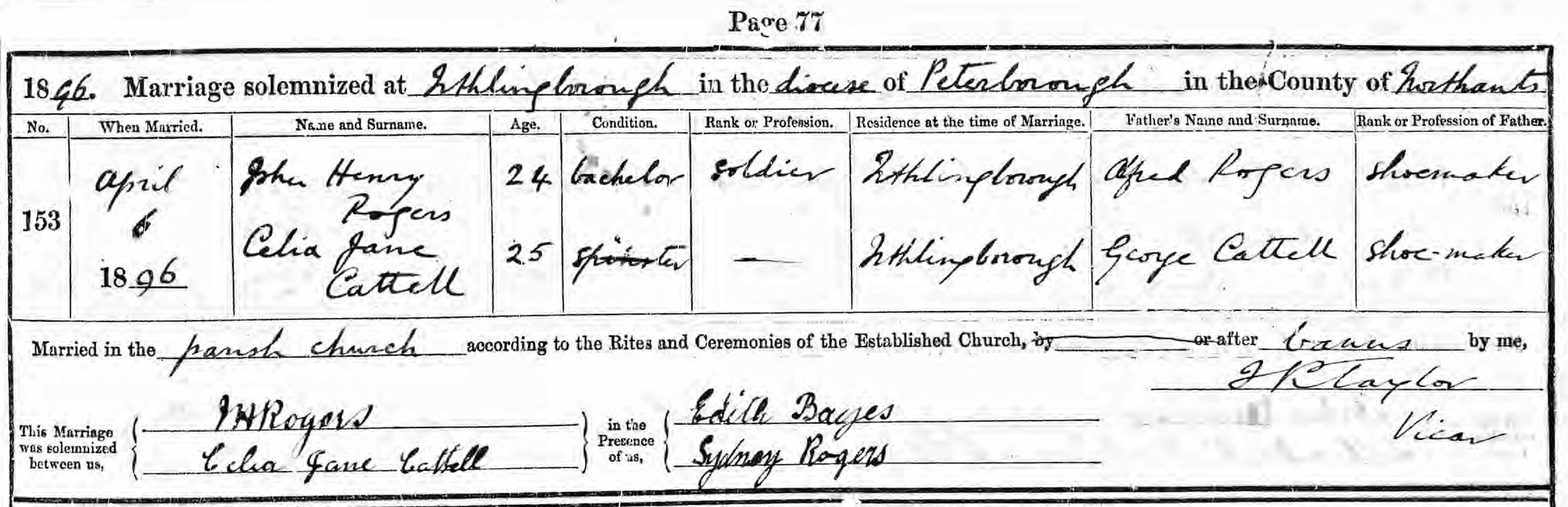 Parish Registers of St. Peter, Irthlingborough, Northamptonshire; Marriage entry for John Henry Rogers and Celia Jane Cattell, 6 Apr 1896, Page 77, No 153.