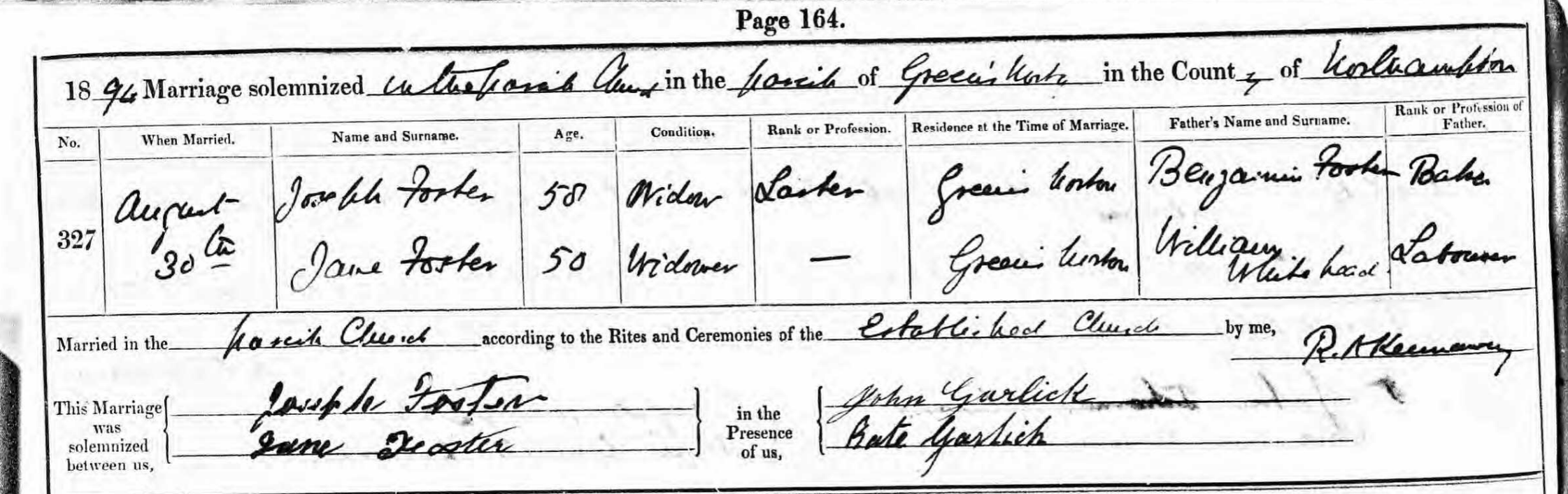 Joseph Foster, 58, Widower, occupation Laster, abode Greens Norton and Jane Foster, 50, Widow, abode Greens Norton. Groom's father: Benjamin Foster, occupation Baker. Bride's father: William Whitehead, occupation Labourer. Groom signed name. Bride signed name. Witness: John Garlick (signed). Witness: Kate Garlick (signed).