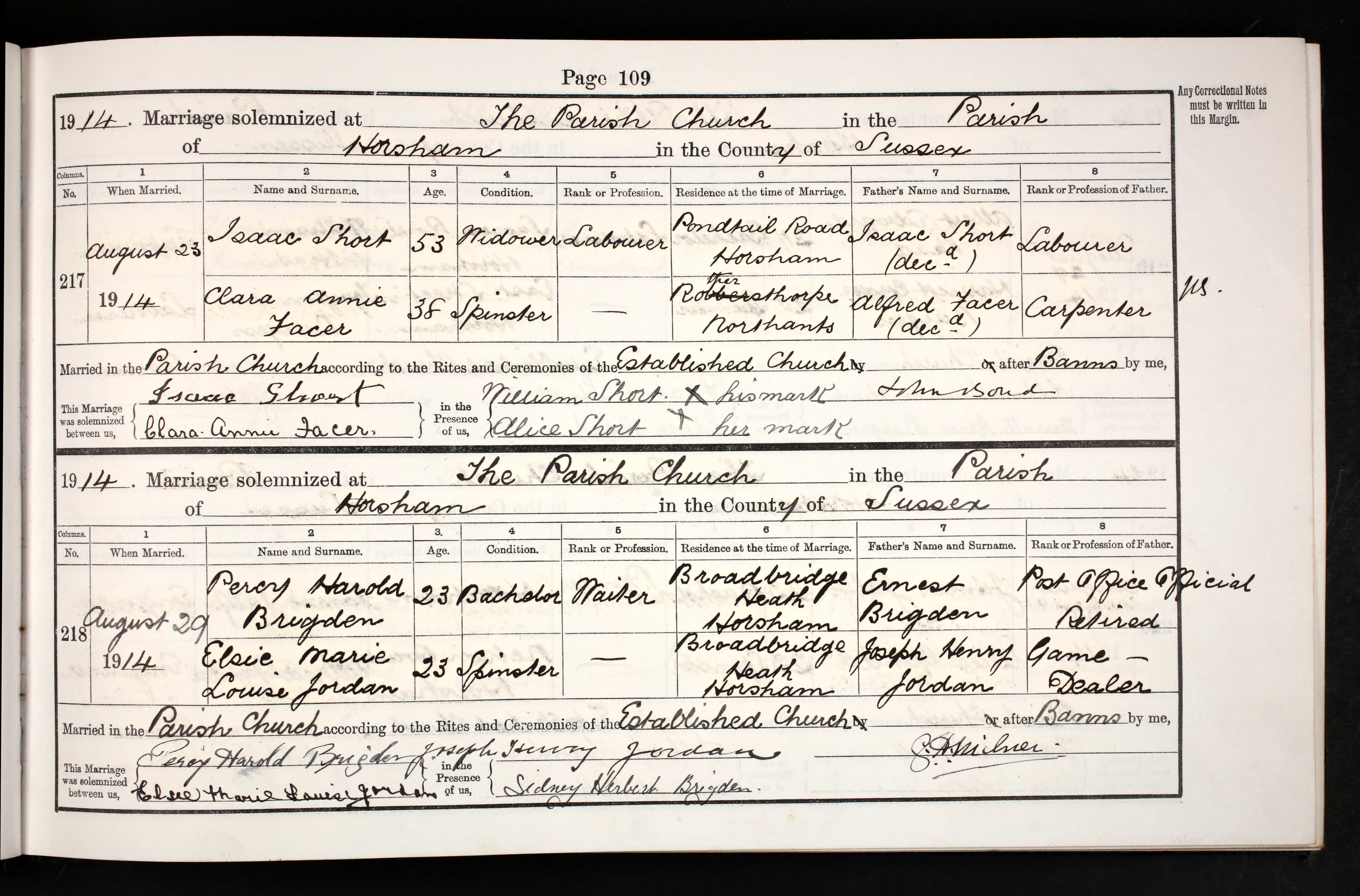 Parish Registers of St. Mary, Horsham, Sussex; Marriage entry for Isaac Short and Clara Annie Facer, 23 Aug 1914, Page 109, No 217.