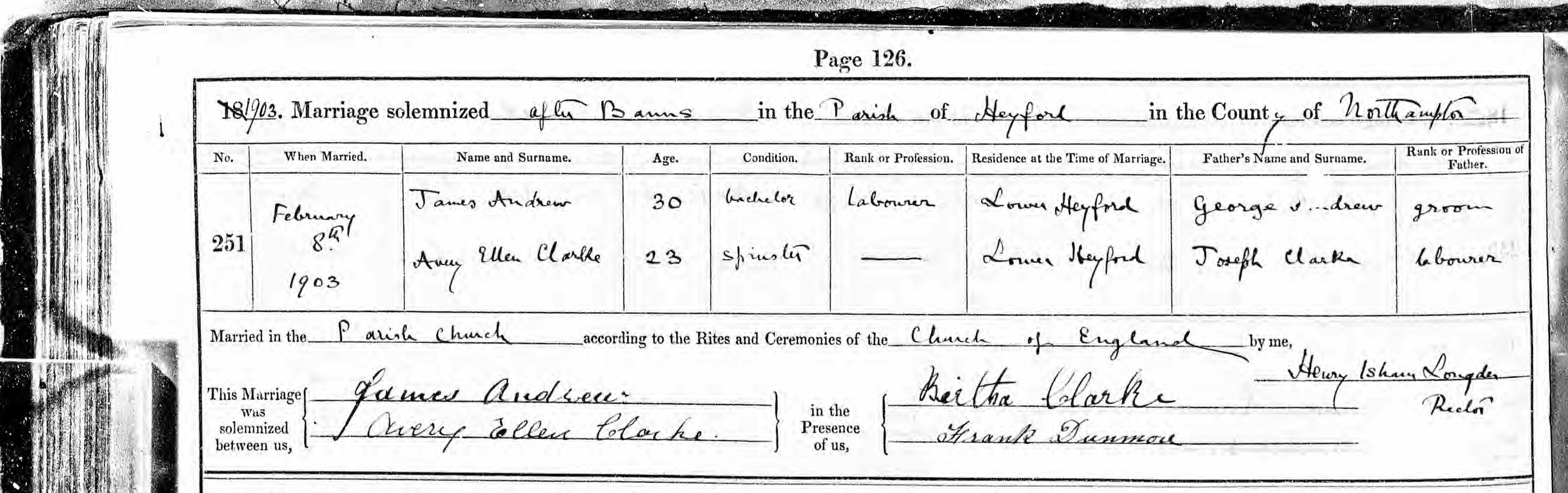 - James Andrew and Avery Ellen Clarke was married on 8 Feb, 1903 at the Church of St. Peter & St. Paul, Heyford, Northamptonshire, England