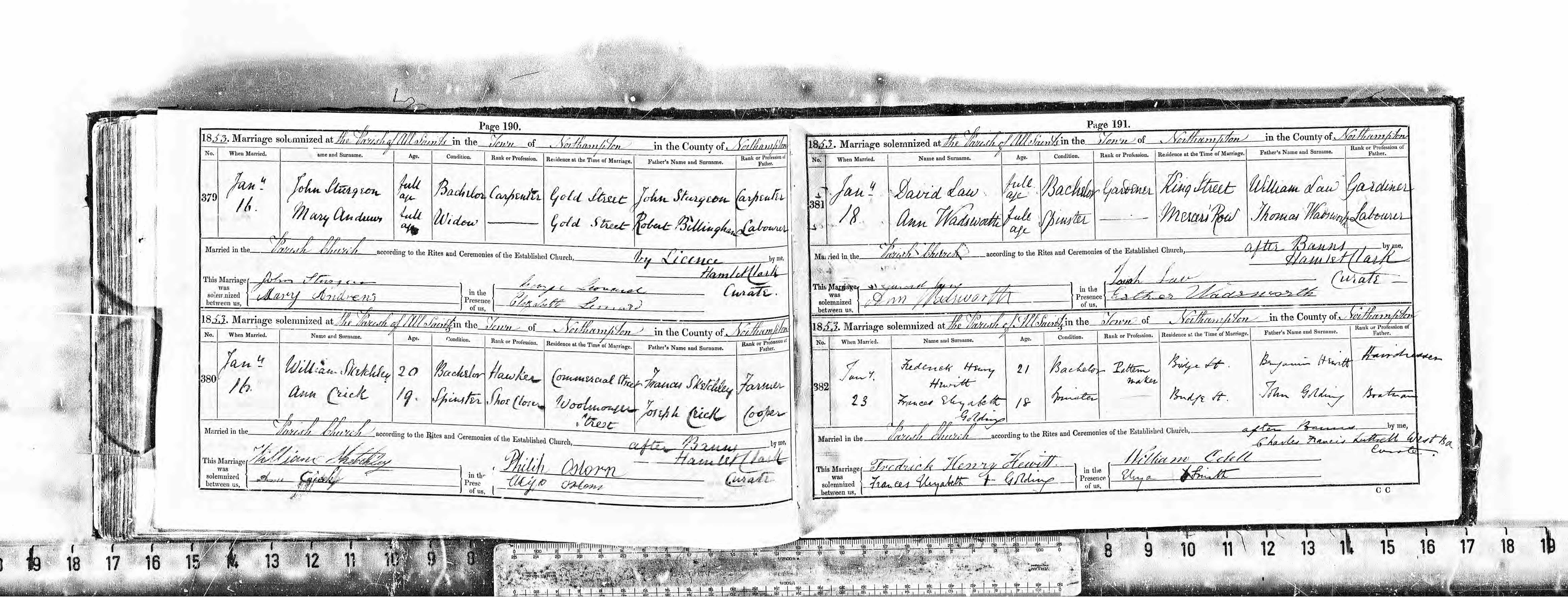 Parish Registers of All Saints, Northampton All Saints, Northamptonshire; Marriage entry for John Sturgeon and Mary Andrews, 16 Jan 1853, Page 190, No 379.