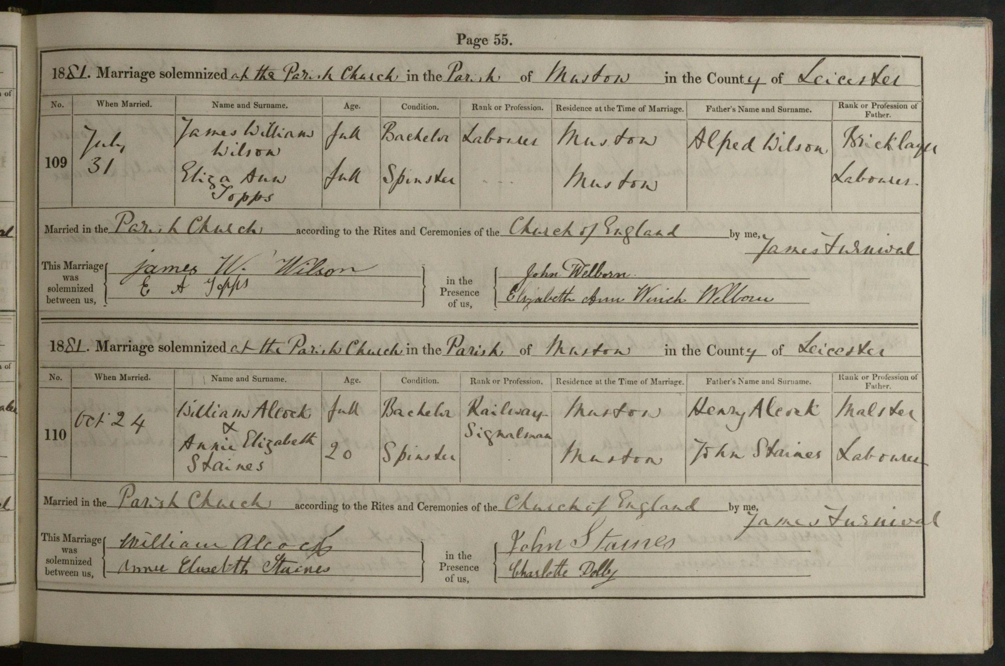 Parish Registers of St John the Baptist, Muston, Leicestershire; Marriage entry for William Alcock and Annie Elizabeth Staines, 24 Oct 1881, Page 55, No 110.