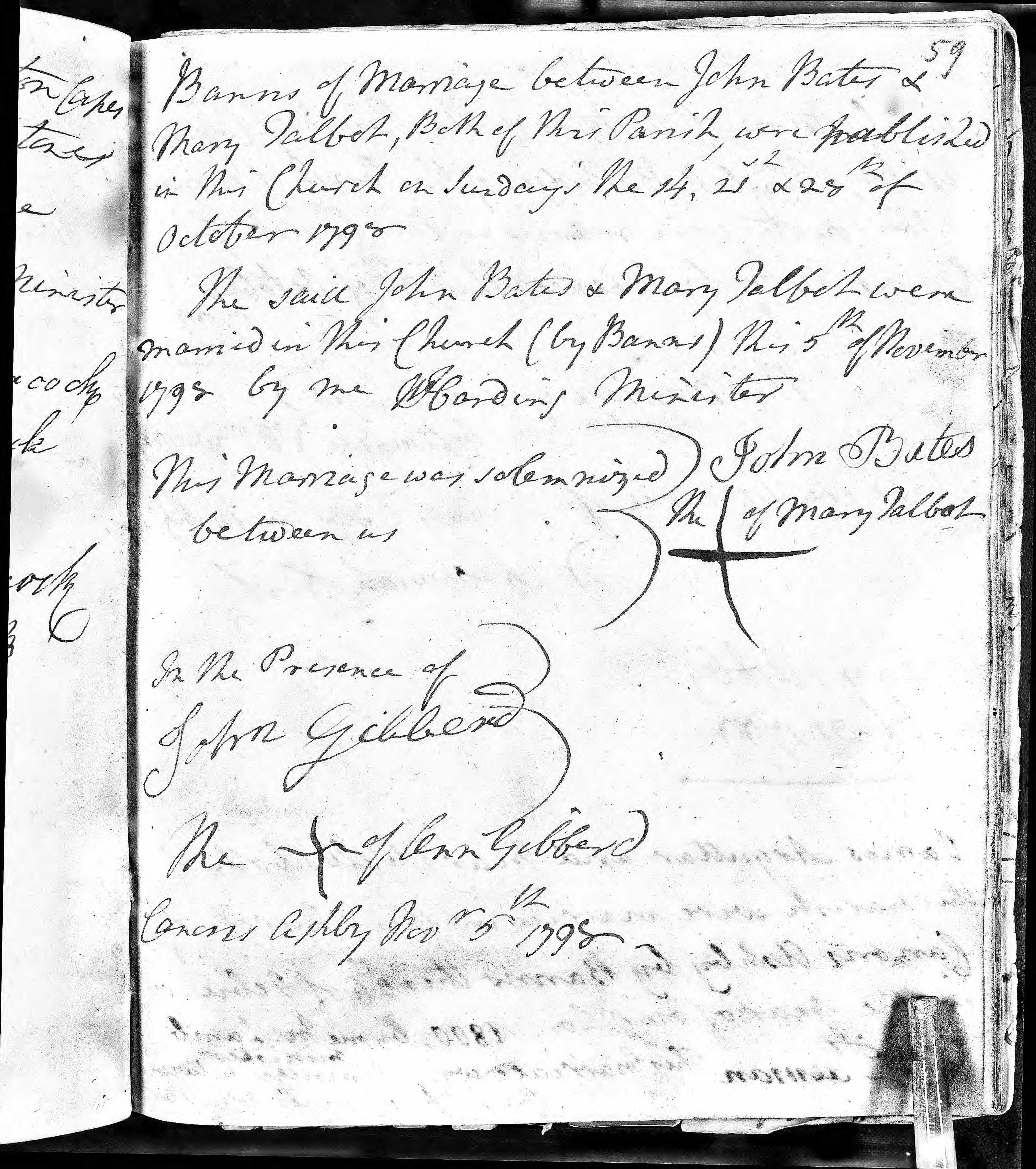 Banns of Marriage between John Bates and Mary Talbot, both of this Parish, were published in this Church on Sunday's the 14th, 21st and 28th of October 1798. The said John bates and Mary Talbot were married in this Church (by Banns) this 5th November 1798. Groom signed, bride did not. Witnesses John Gibberd (signed) and Ann Gibberd (did not sign).