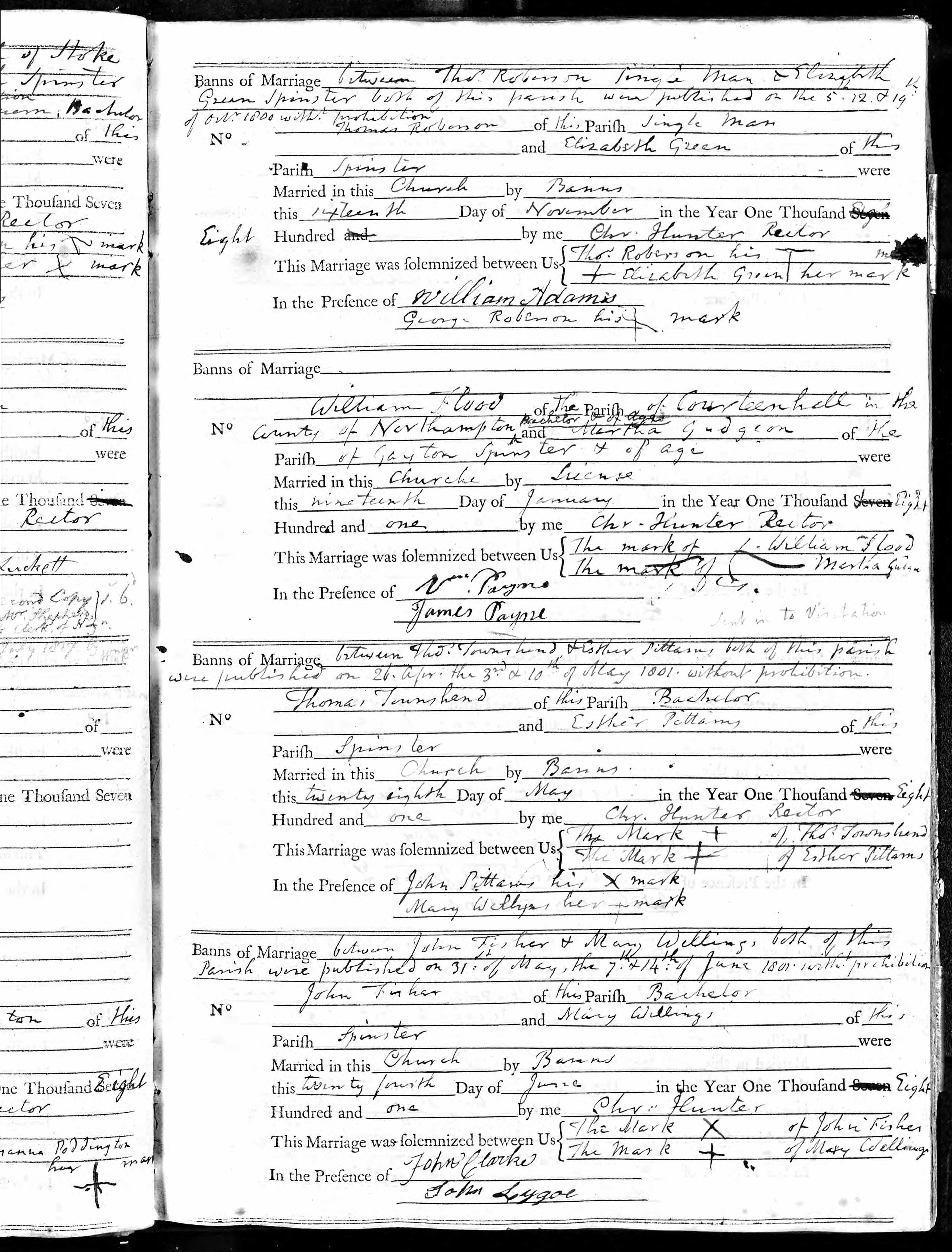 Parish Registers of St Nicholas, Gayton, Northamptonshire; Marriage entry for Thomas Townshend and Esther Pithams, 28 May 1801.