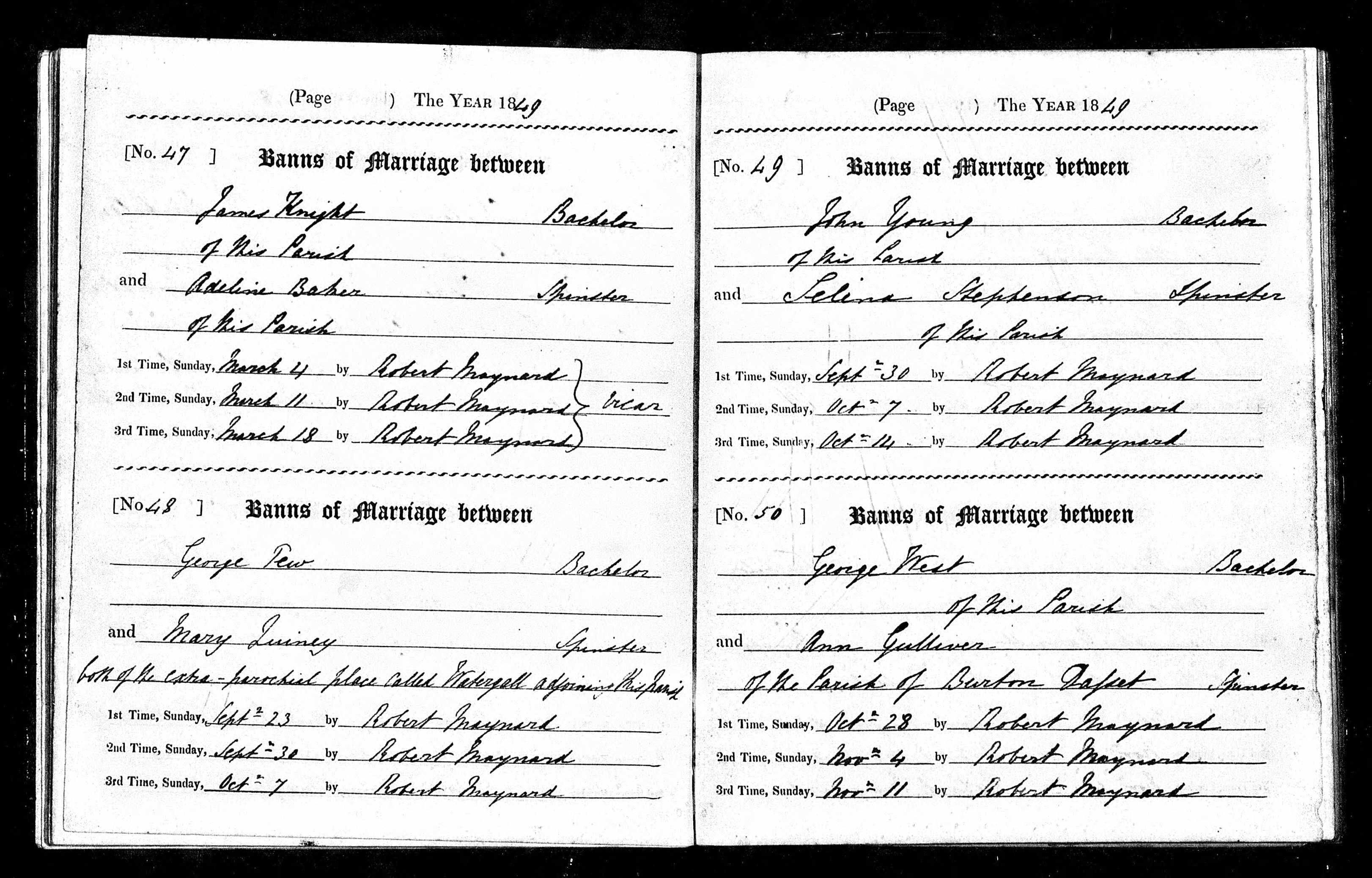 George Tew, bachelor and Mary Quiney, spinster, both of the extra-parochial place called Watergall adjoining this parish. Banns publised 23 Sep, 30 Sep and 7 Oct.