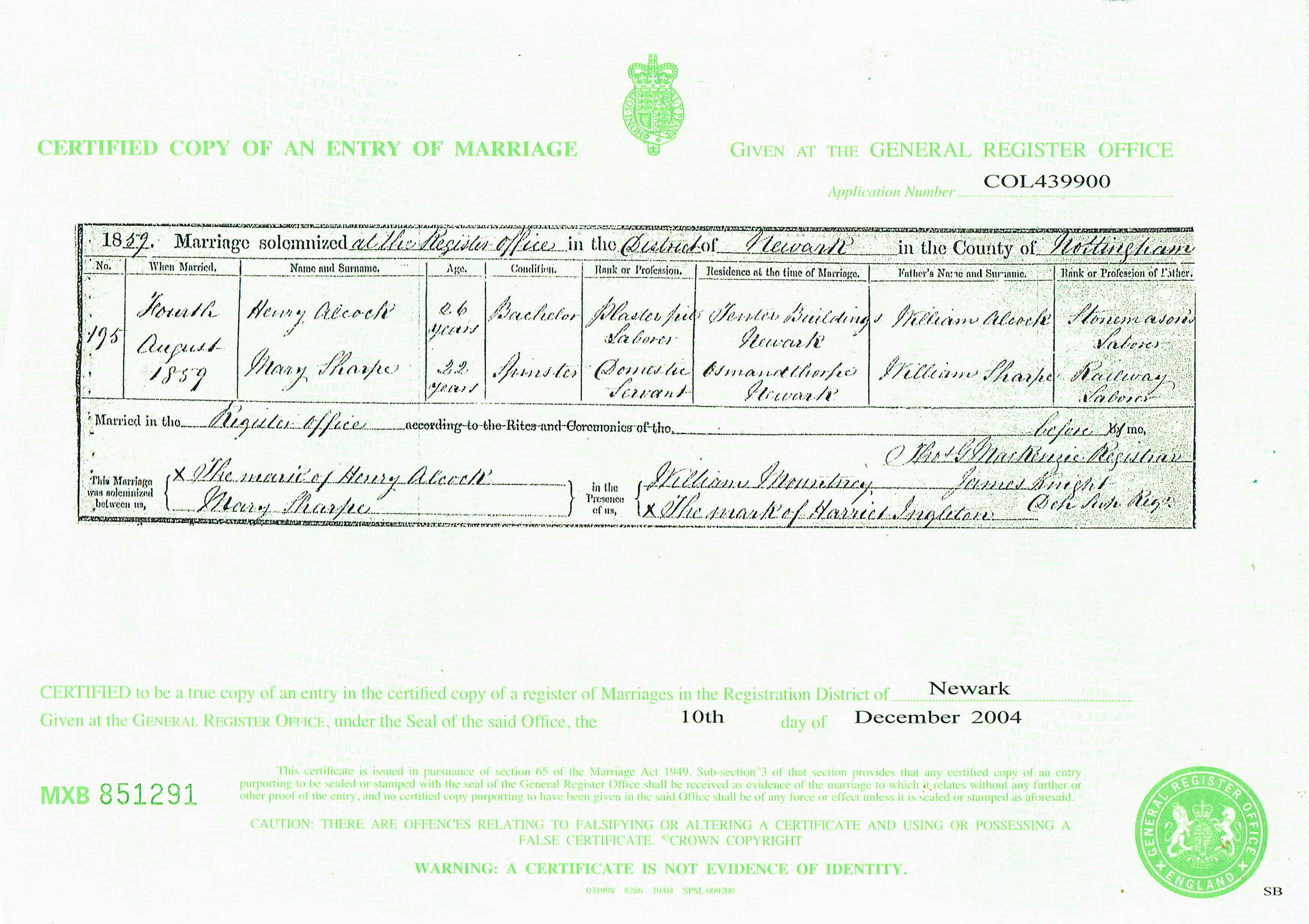 General Register Office of England and Wales; Marriage entry for Henry Alcock and Mary Sharpe, Newark, Jul-Sep Qtr 1859, Vol 7b, Page 451, No 195; Certified copy obtained 10 Dec 2004.