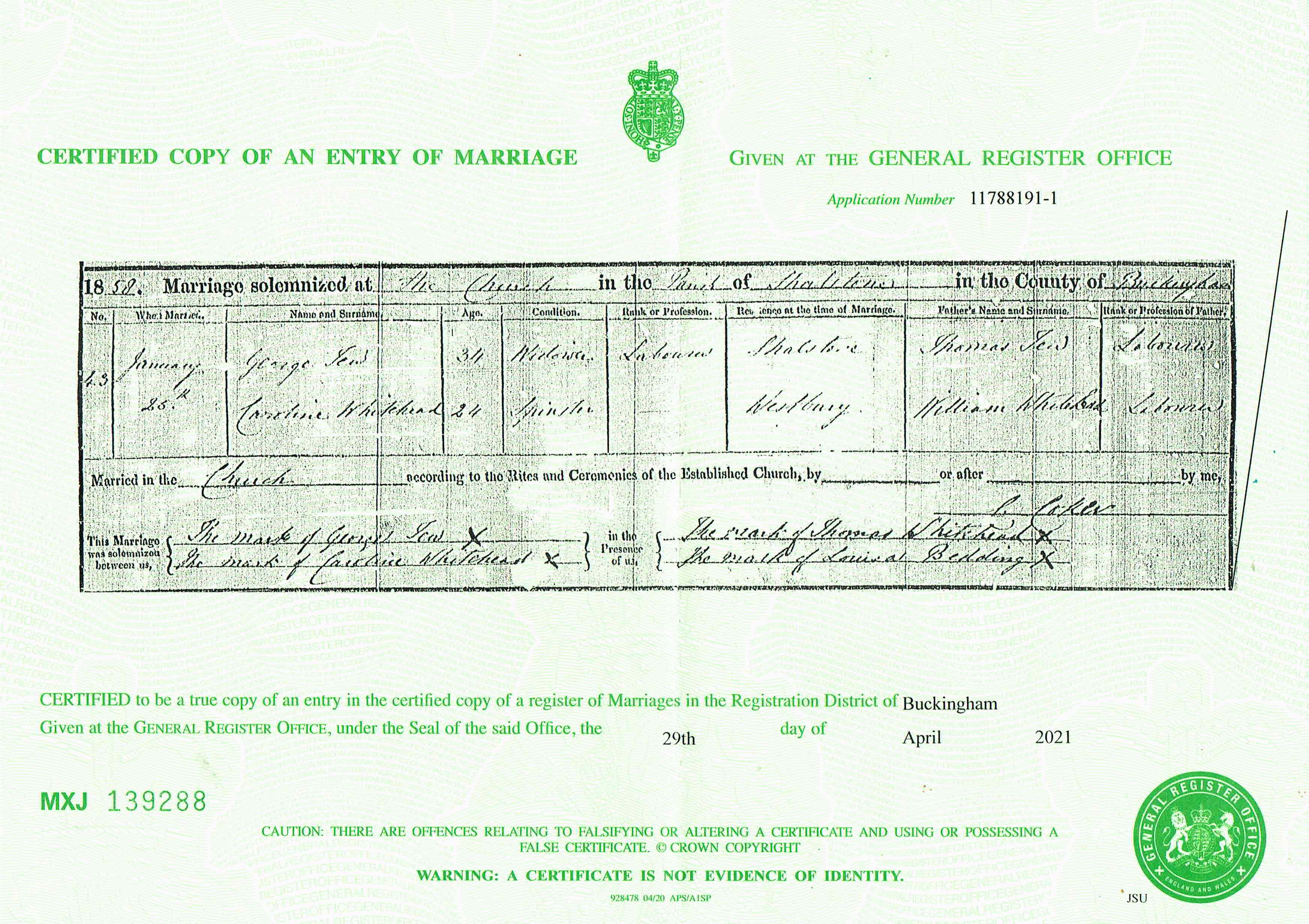 General Register Office of England and Wales; Marriage entry for George Tew and Caroline Whitehead, Buckingham, Jan-Mar Qtr 1858, Vol 3a, Page 509, No 43; Certified copy obtained 29 Apr 2021.