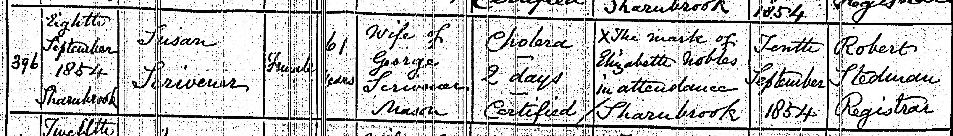 Death in the Registration District of Bedford, Bedfordshire, 1854, no. 396. Died 8 Sep 1854 at Sharnbrook; Susan Scrivener; Female; age 61; Wife of George Scrivener, Mason. Cause of death: Cholera 2 days; certified. Informant was Elizabeth Nobles (could not sign name); relation: Not known; residing at Sharnbrook; present at death. The death was registered 10 Sep 1854.