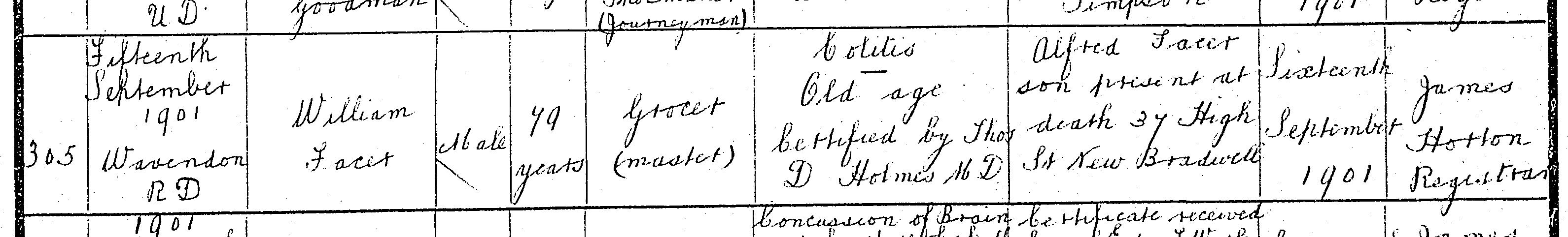 Death in the Registration District of Newport Pagnell, Buckinghamshire, 1901, no. 305. Died 15 Sep 1901 at Wavendon; William Facer; Male; age 79; Grocer (Master). Cause of death: Colitis; oldage, certified. Informant was Alfred Facer (signed name); relation: Son; residing at 37 High Street, New Bradwell; present at death. The death was registered 16 Sep 1901.
