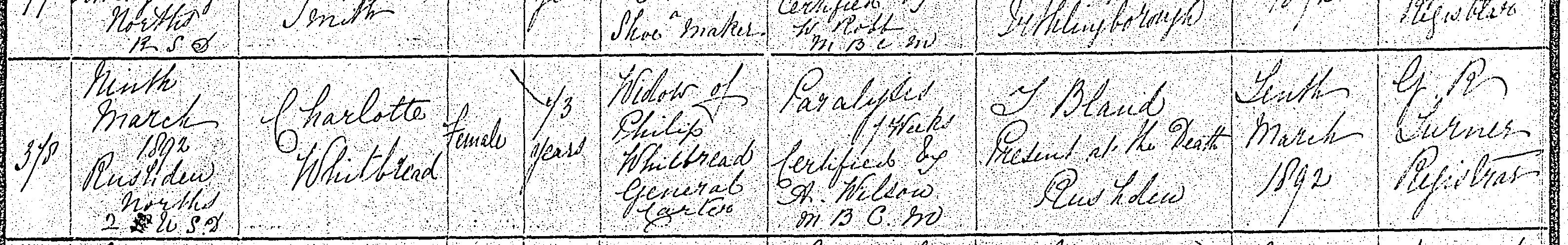 Death in the Registration District of Wellingborough, Northamptonshire, 1892, no. 378. Died 9 Mar 1892 at Rushden; Charlotte Whitbread; Female; age 73; Widow of Phillip Whitbread, general carter. Cause of death: Paralysis 7 weeks certified. Informant was J Bland (signed name); relation: Not known; residing at Rushden; present at death. The death was registered 10 Mar 1892.