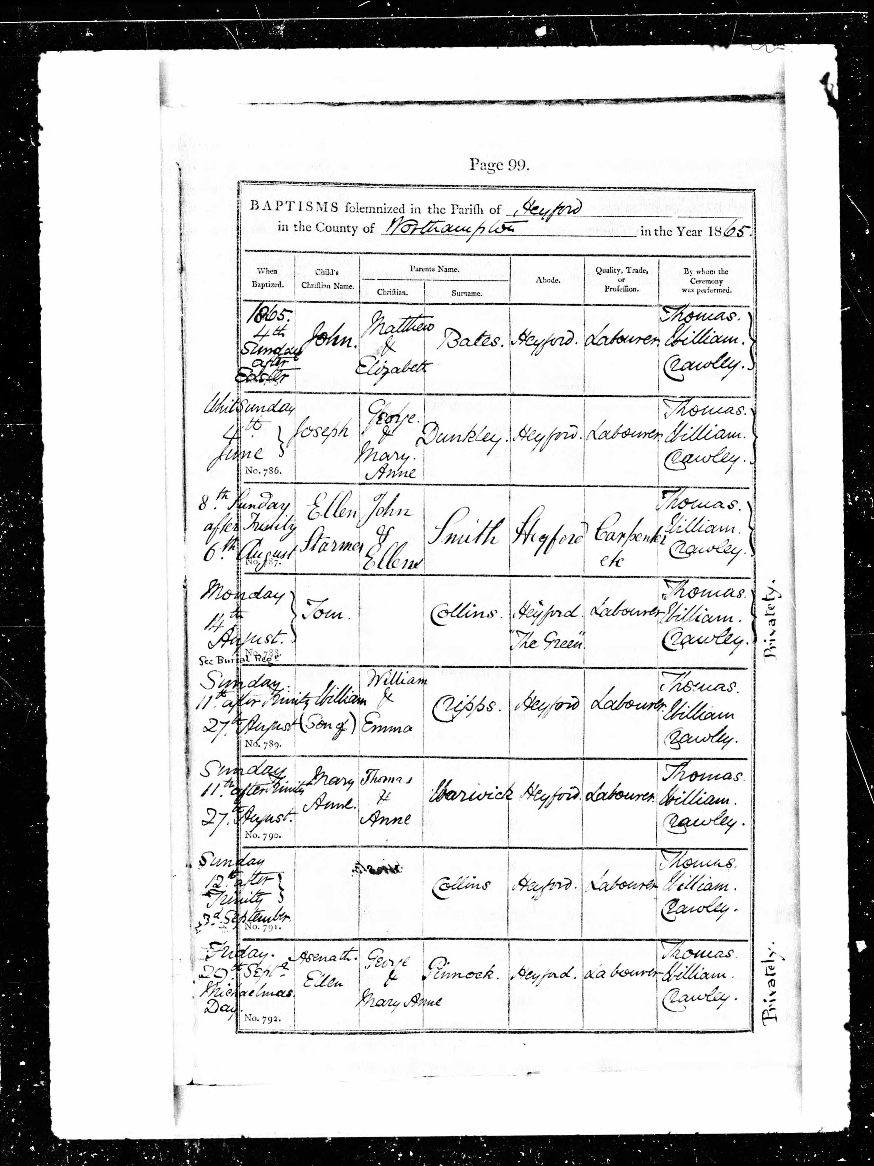 Parish Registers of St Peter & St Paul, Heyford, Northamptonshire; Baptism entry for John Bates, 1865 4th Sunday after Easter, Page 99, No 785.