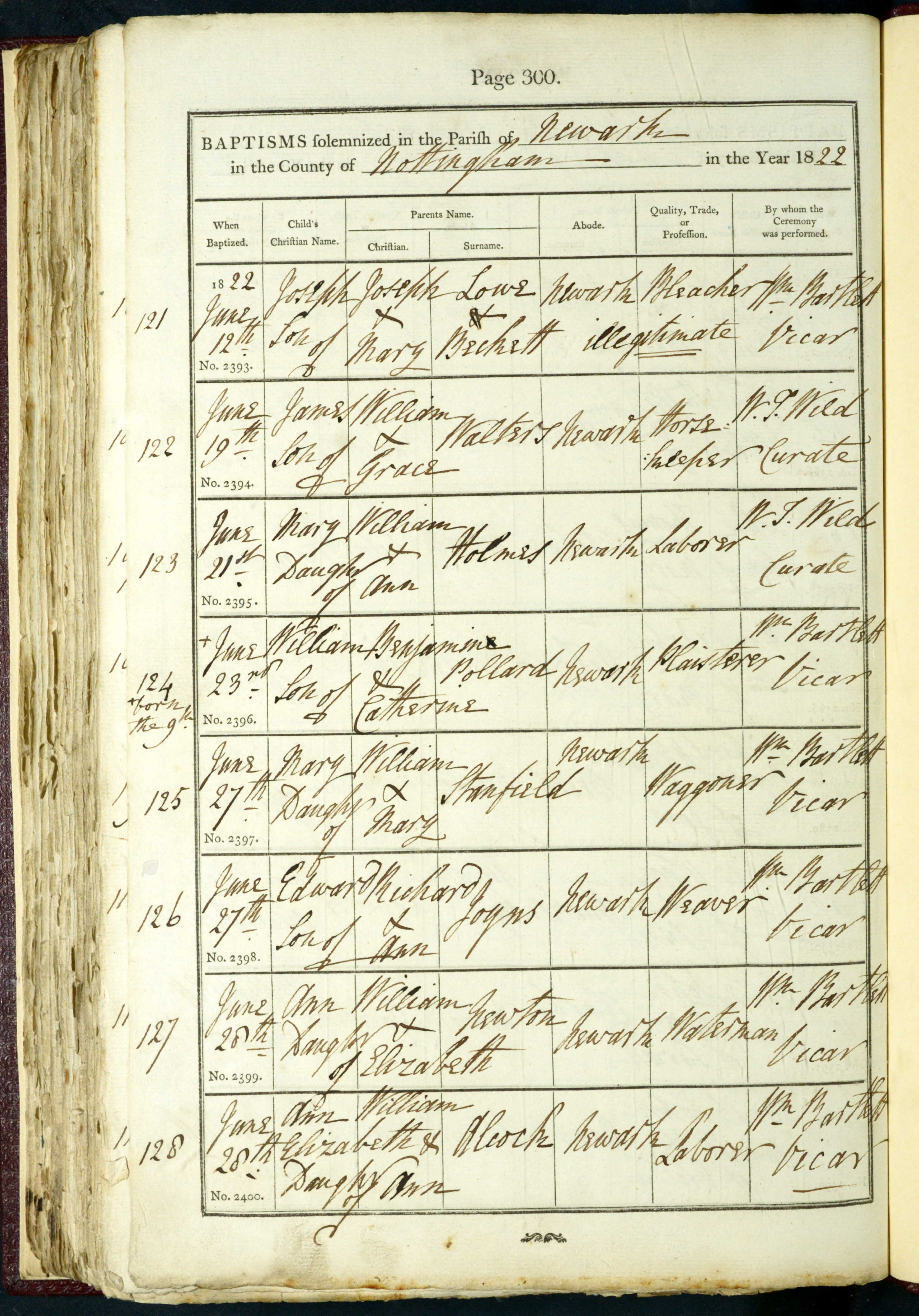 Parish Registers of St. Mary Magdalene, Newark, Nottinghamshire; Baptism entry for Ann Elizabeth Alcock, 28 Jun 1822, Page 300, No 2400, No 128.