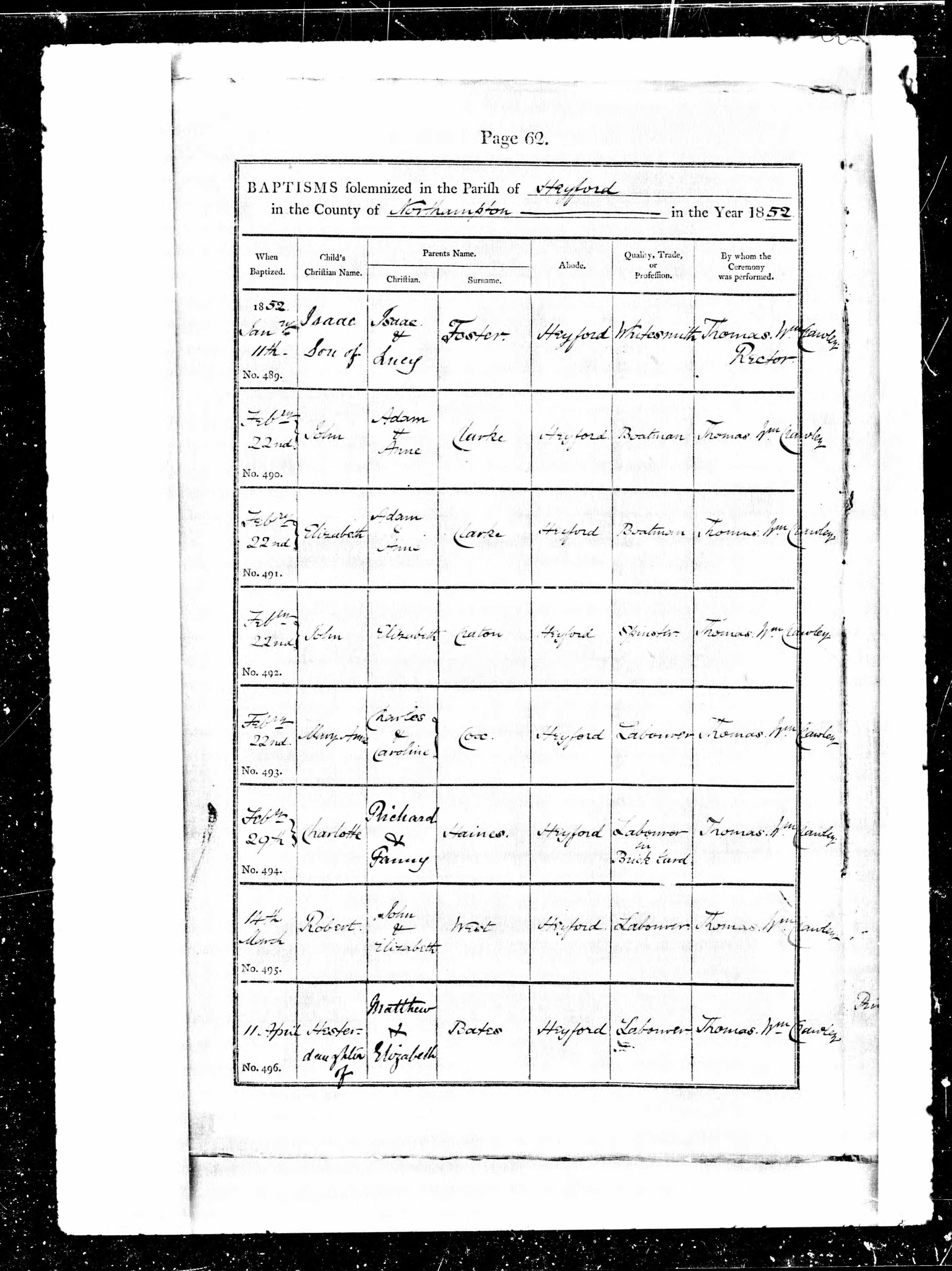 Parish Registers of St Peter & St Paul, Heyford, Northamptonshire; Baptism entry for Elizabeth Clarke, 22 Feb 1852, Page 62, No 491.