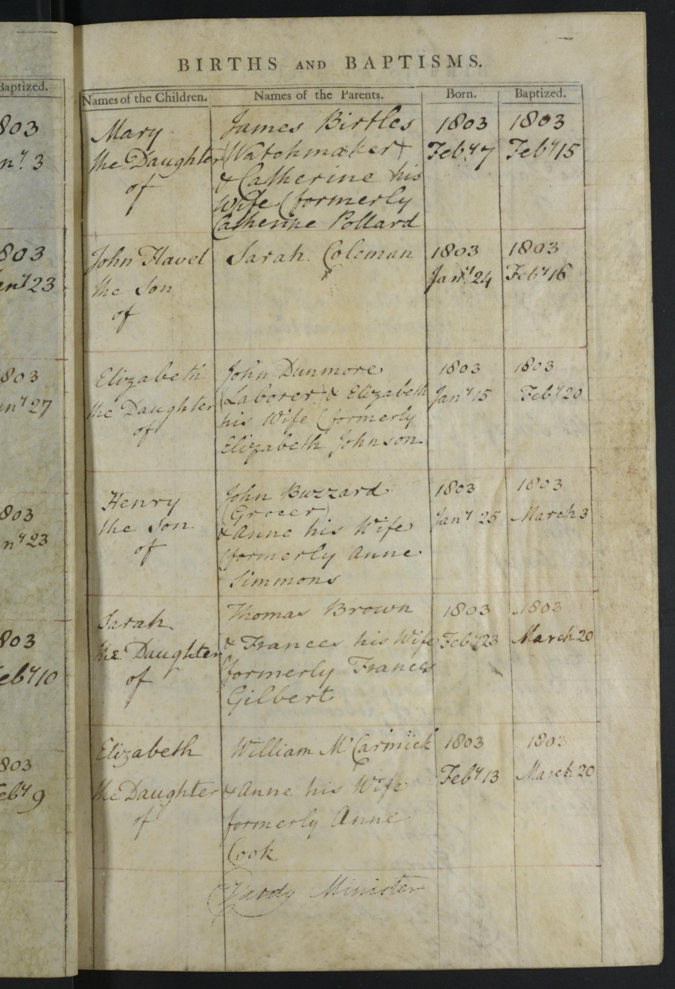 Elizabeth dau of John and Elizabeth Dunmore, formerly Johnson, occ. Labourer, born 15 Jan 1803