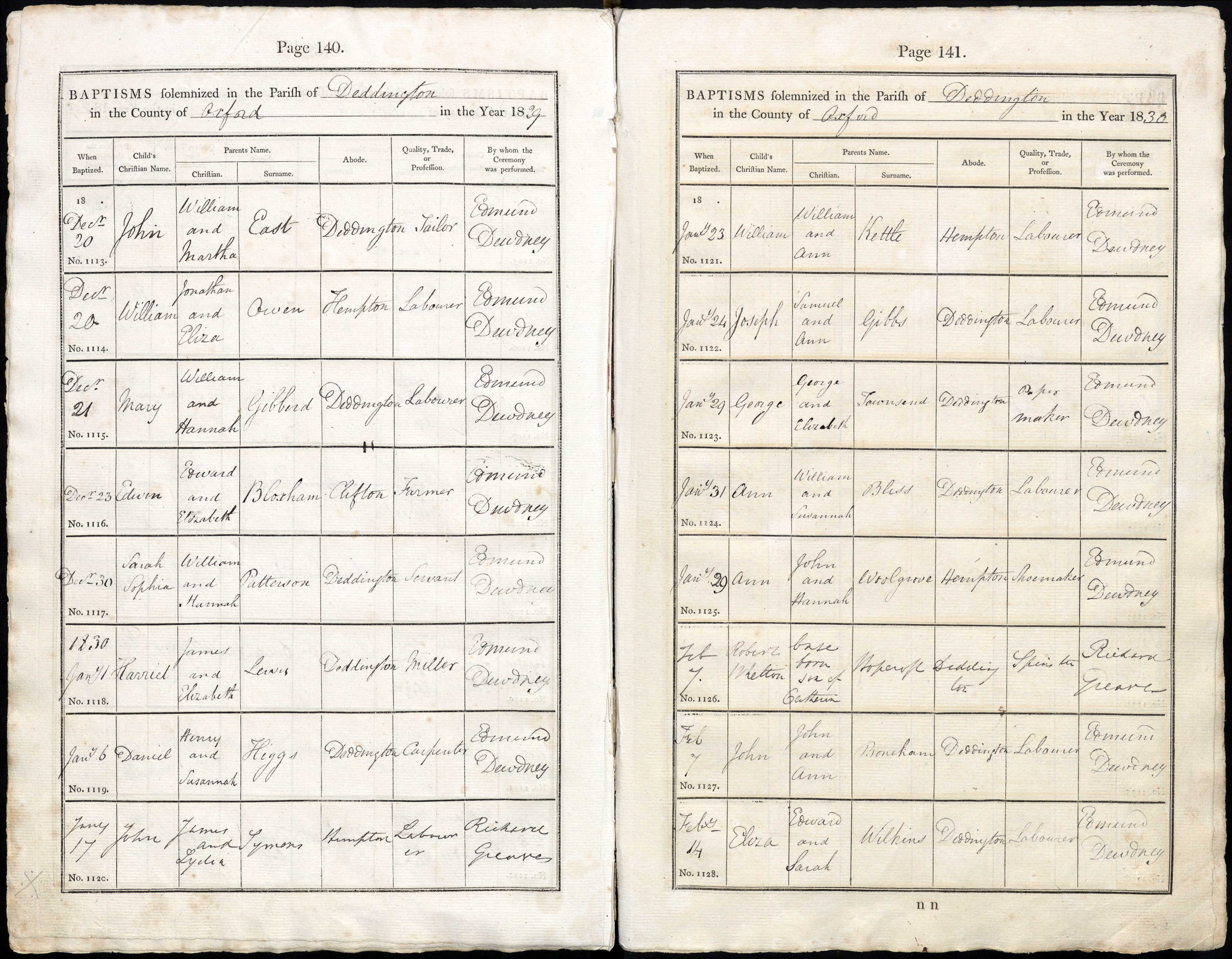 Parish Registers of St. Peter & St. Paul, Deddington, Oxfordshire; Baptism entry for Daniel Higgs, 6 Jan 1830, Page 140, No 1119.
