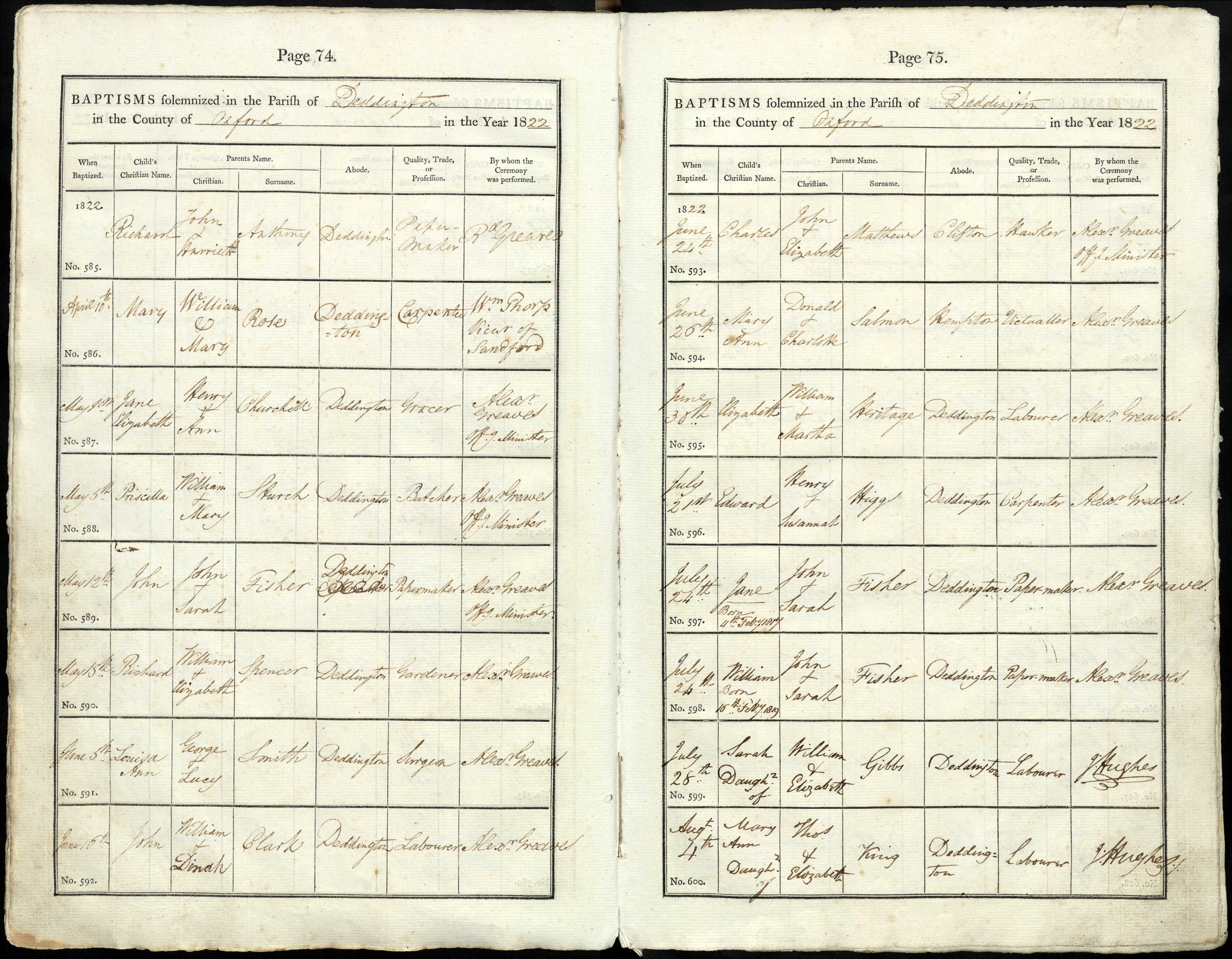 Parish Registers of St. Peter & St. Paul, Deddington, Oxfordshire; Baptism entry for Edward Higgs, 2 Jul 1822, Page 75, No 596.