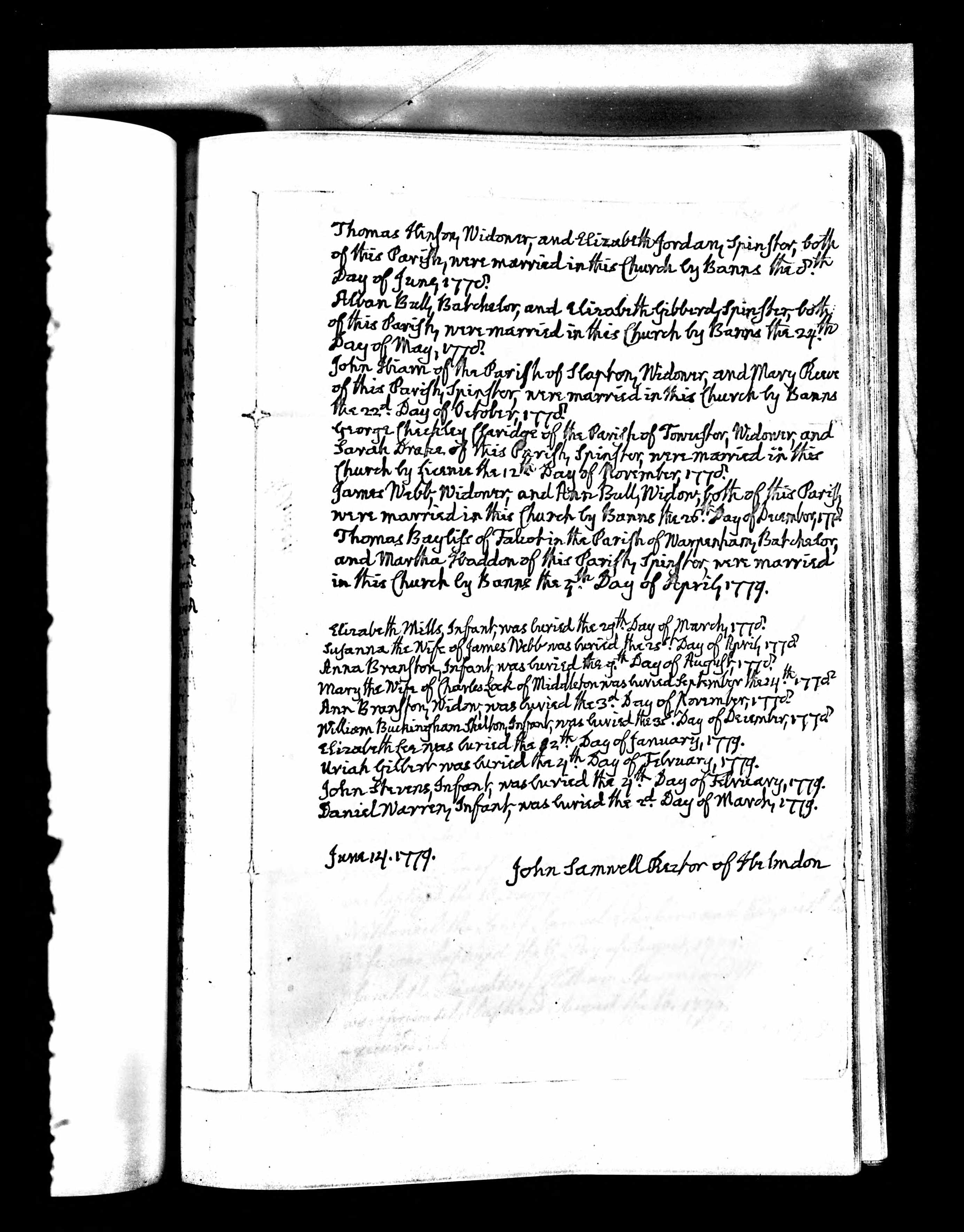 Bishop's Transcripts for the Diocese of Peterborough, England; Marriage entry for Thomas Hinson and Elizabeth Jordan, Helmdon, 8 Jun 1778.