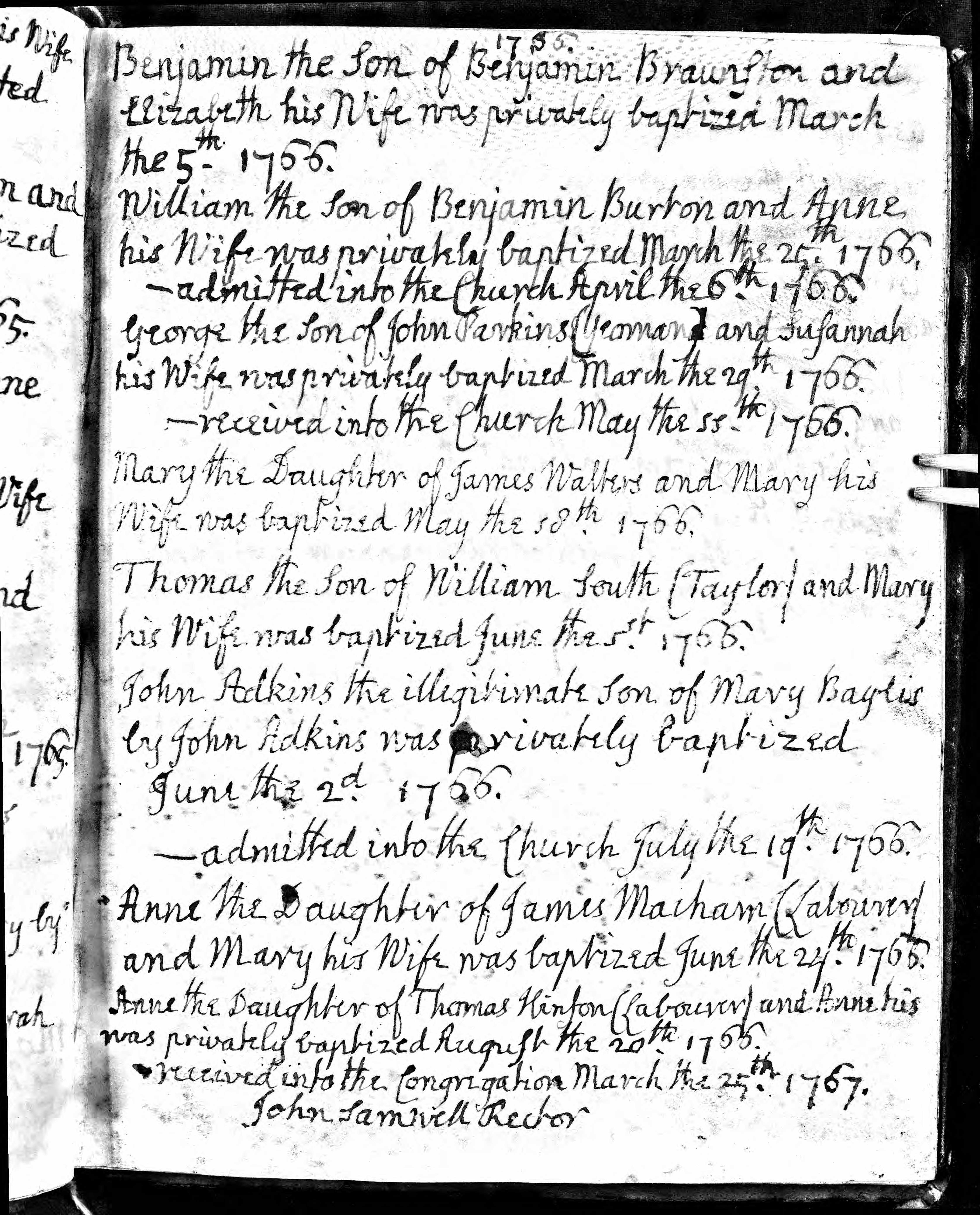 Anne dau of Thomas and Anne Hinson, privately baptized, received into the congregation 25 Mar 1767