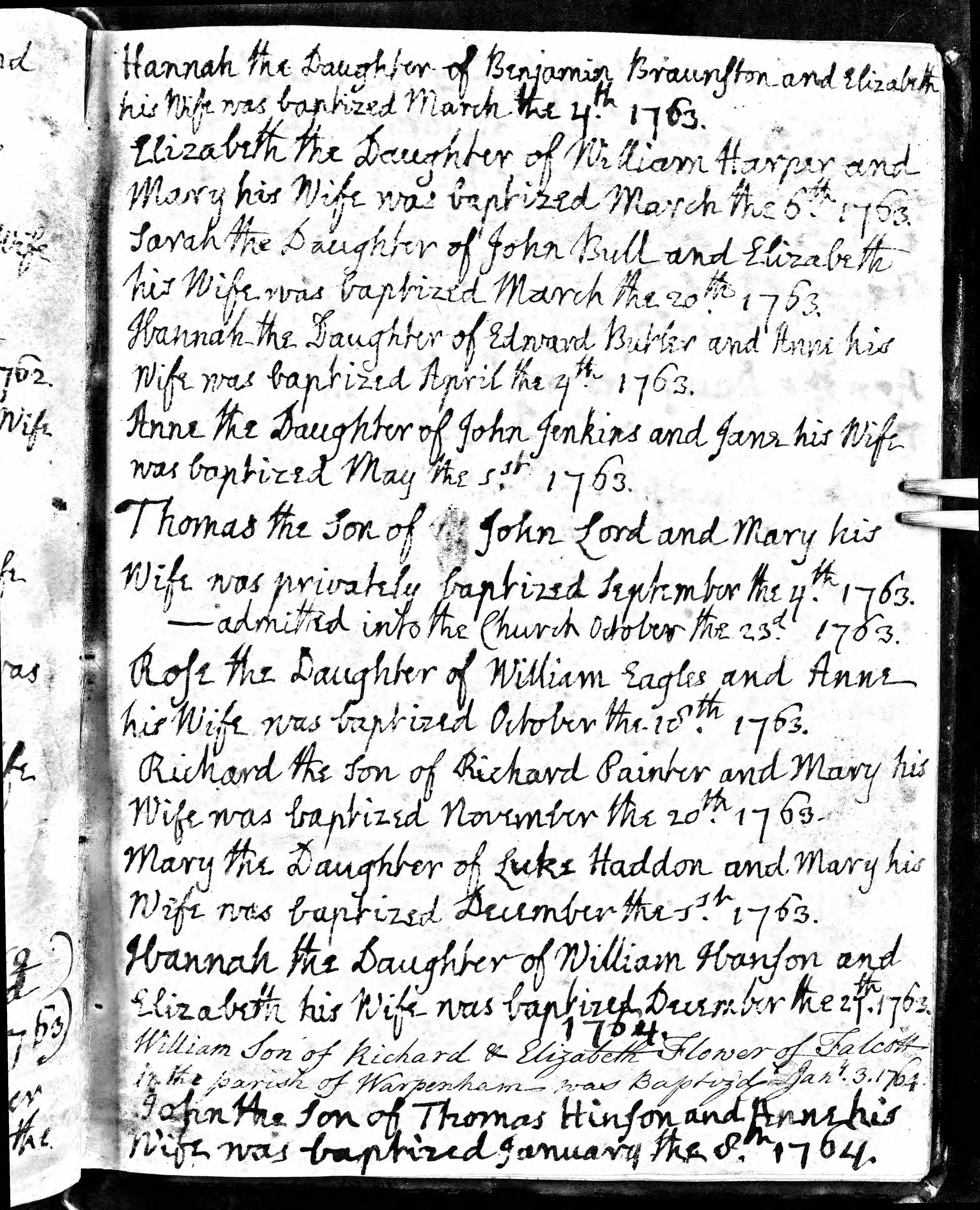 Baptism entry for John Hinson, 8 Jan 1764