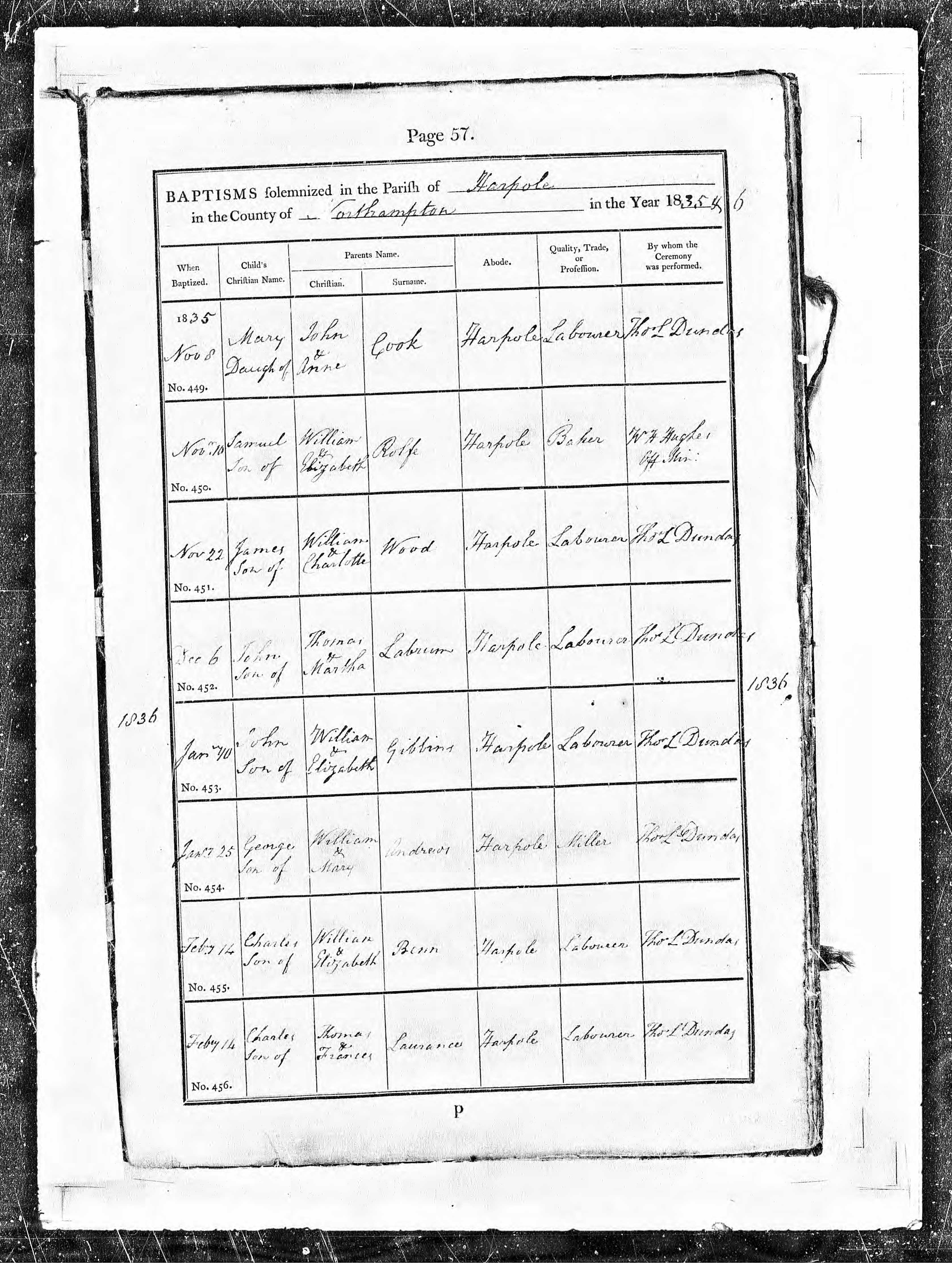 Parish Registers of All Saints, Harpole, Northamptonshire; Baptism entry for George Andrews, 25 Jan 1836, Page 57, No 454.