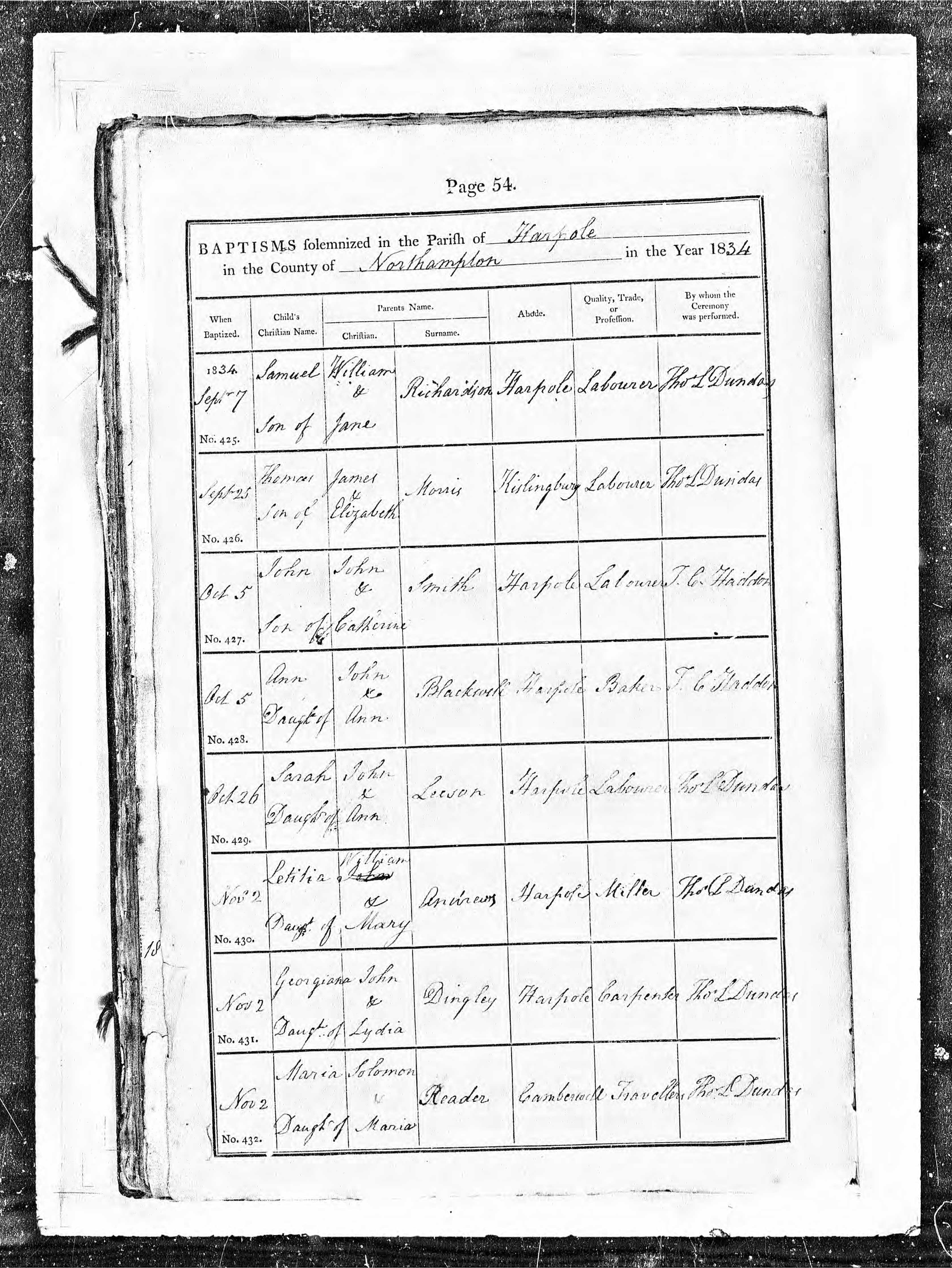Parish Registers of All Saints, Harpole, Northamptonshire; Baptism entry for Letitia Andrews, 2 Nov 1834, Page 54, No 430.